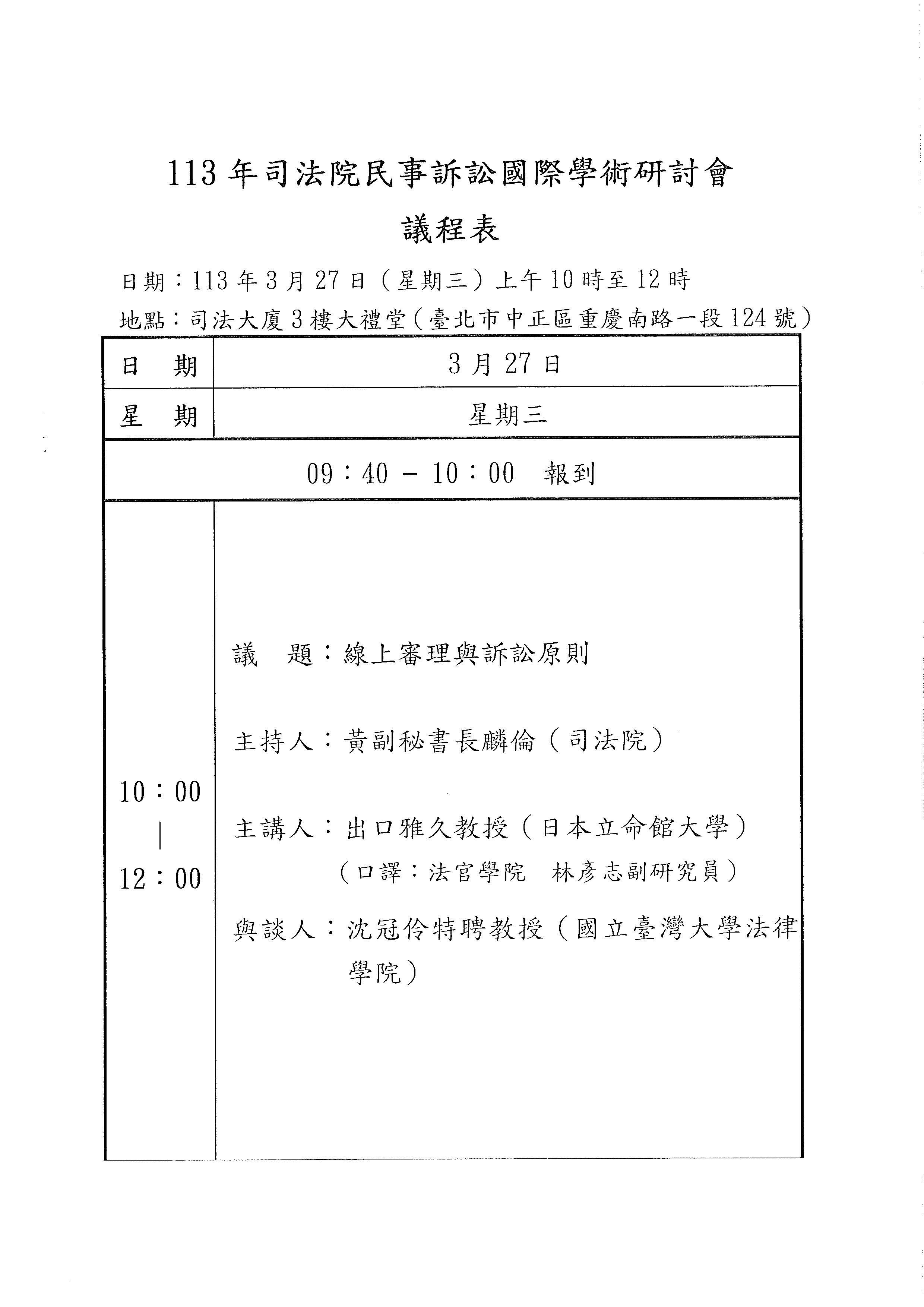 113年3月27日「司法院民事訴訟國際學術研討會:線上審理與訴訟原則」