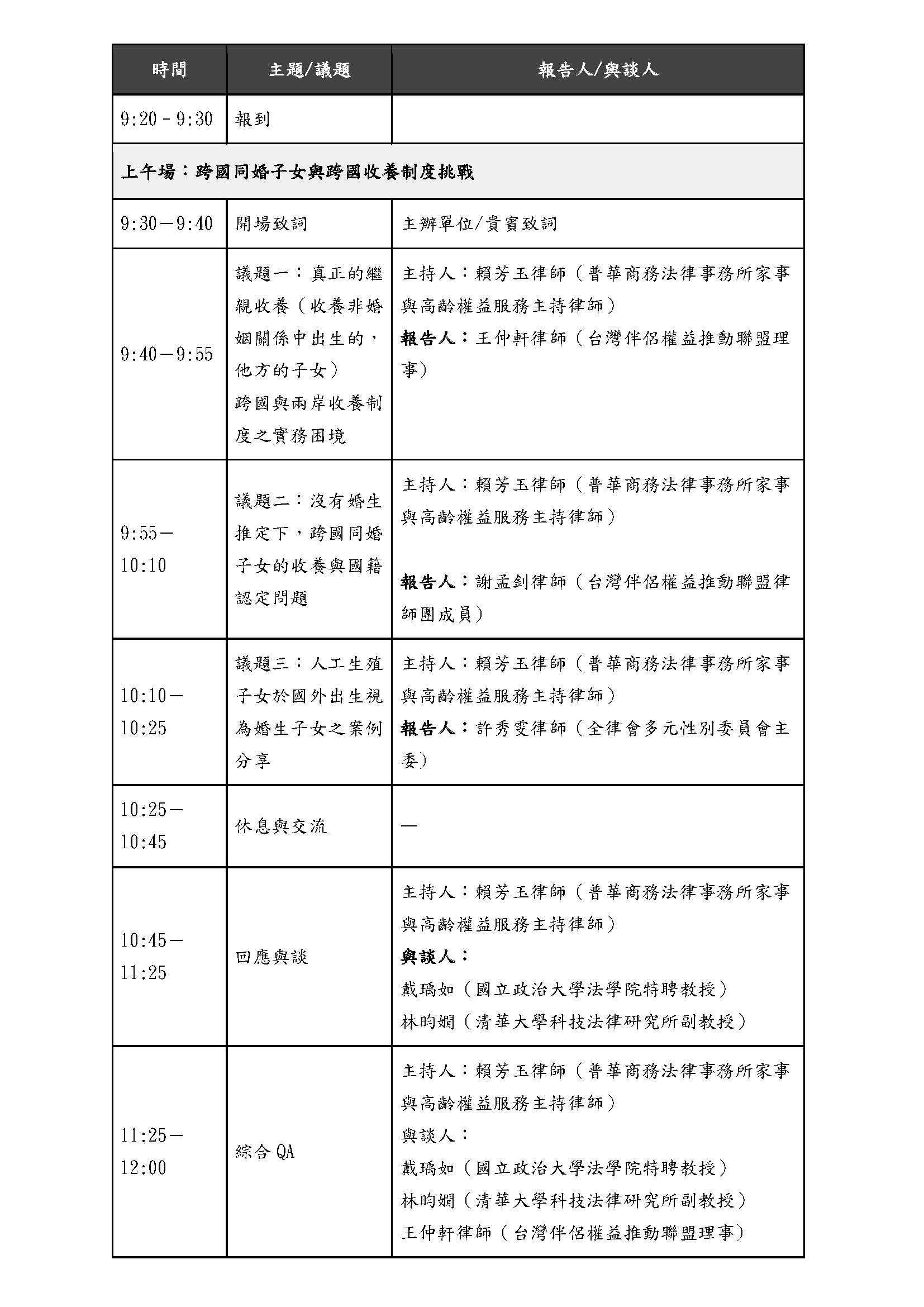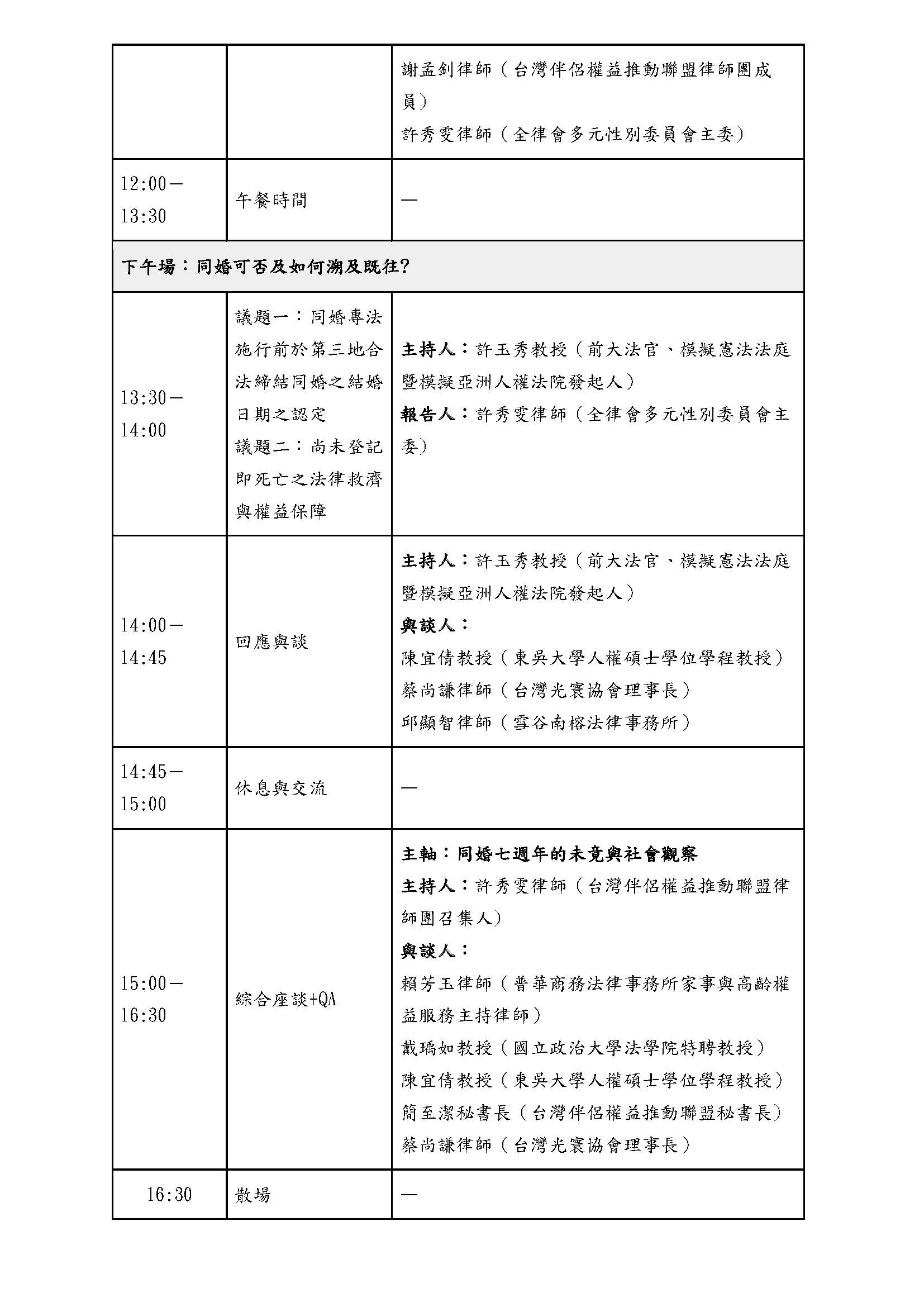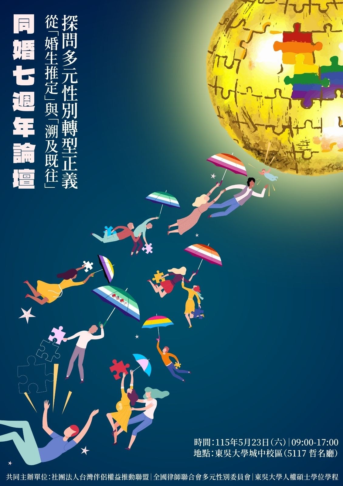 115年5月23日(星期六) 本會多元性別委員會與社團法人台灣伴侶權益推動聯盟、東吳大學人權碩士學位學程合辦同婚七週年論壇:從「婚生推定」與「溯及既往」探問多元性別轉型正義,歡迎踴躍報名!