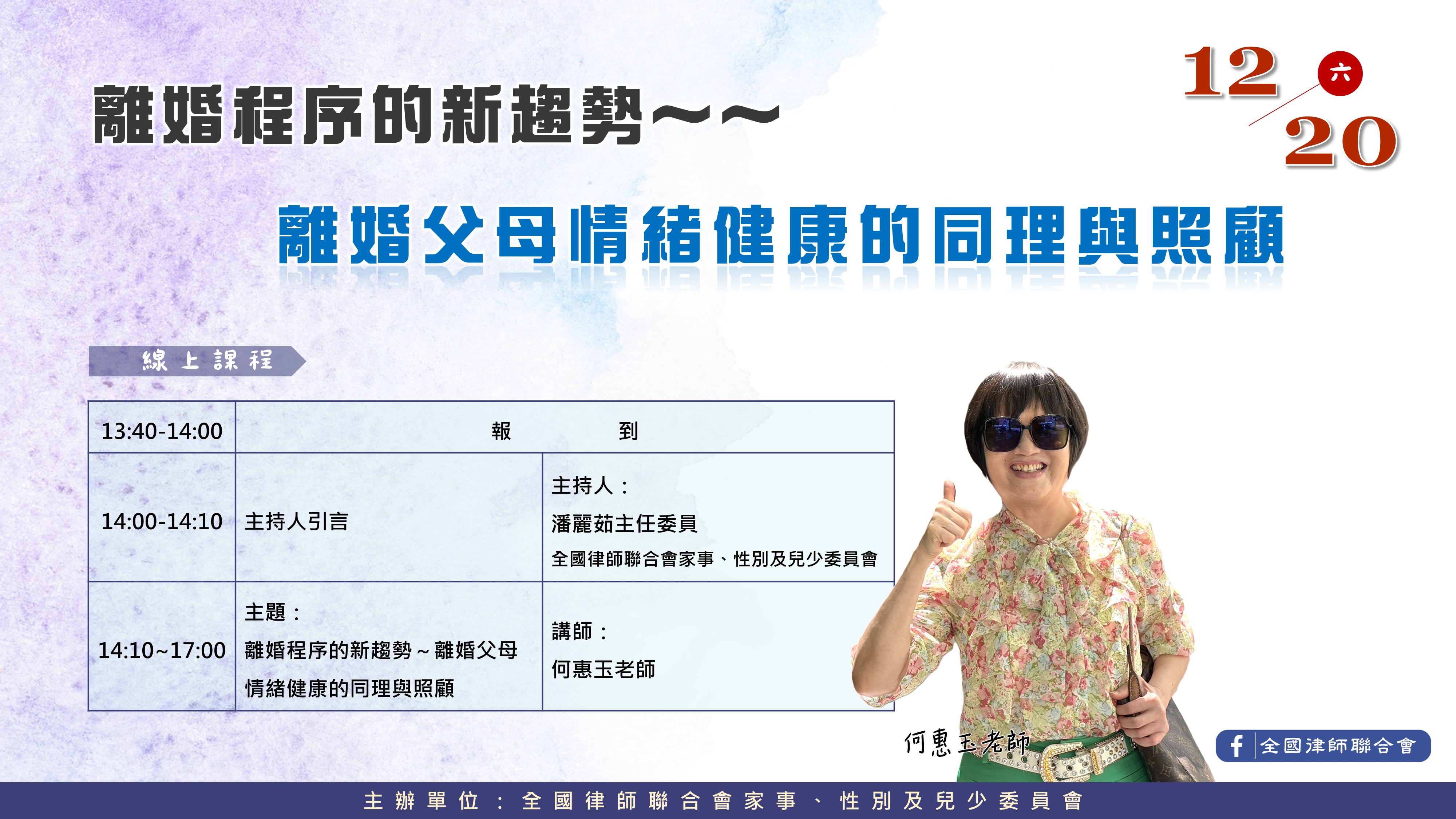 114年12月20日(星期六)離婚程序的新趨勢~離婚父母情緒健康的同理與照顧,歡迎會員踴躍參加。