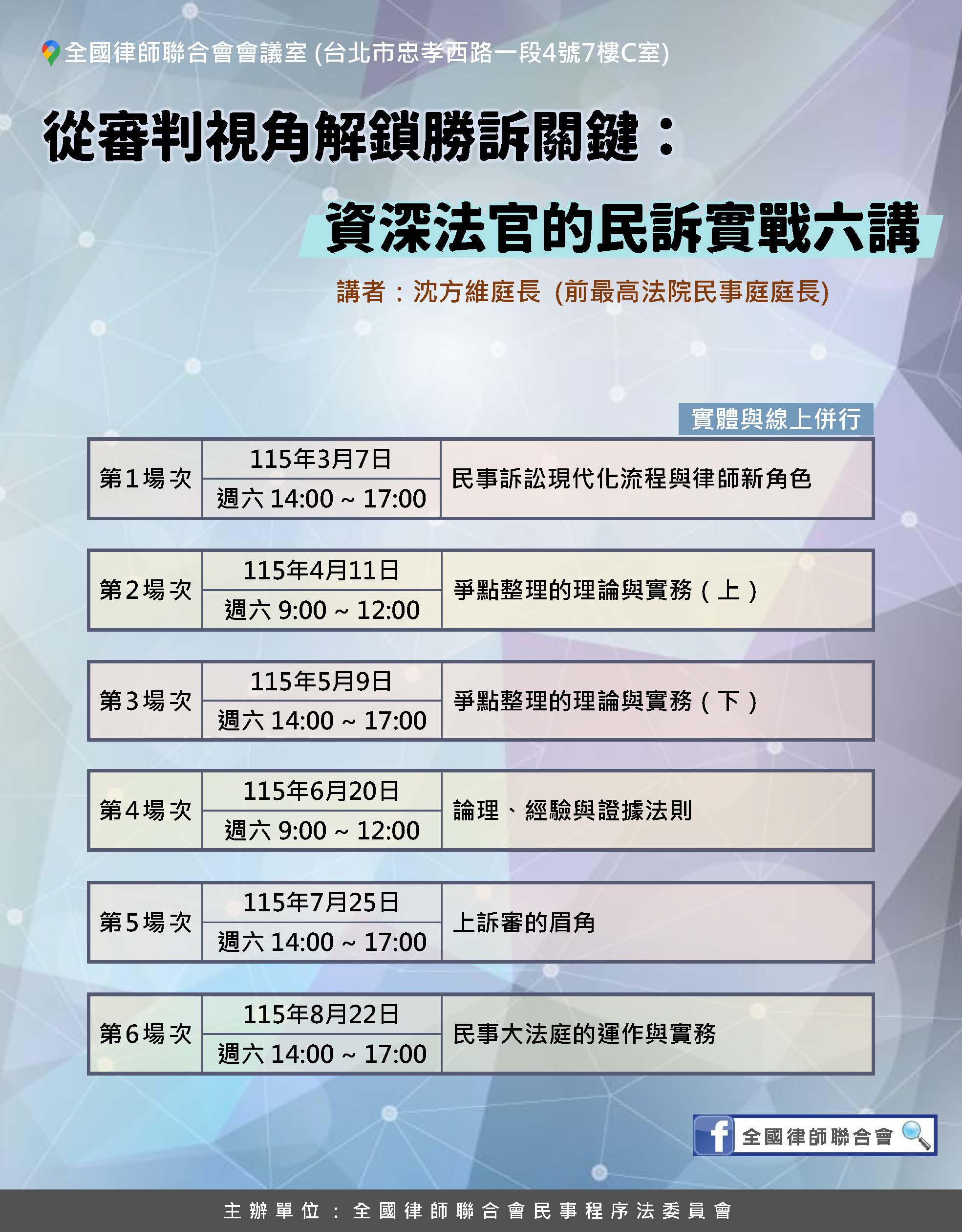 「從審判視角解鎖勝訴關鍵:資深法官的民訴實戰六講」系列課程,歡迎會員踴躍參加。