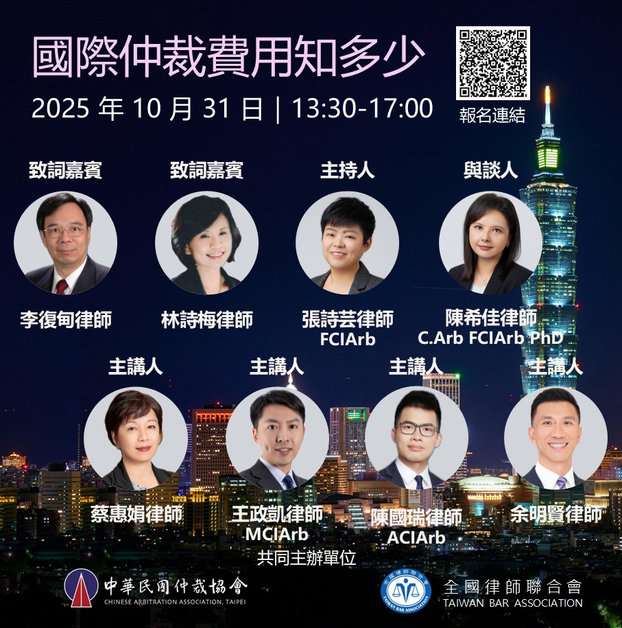 本會及中華民國仲裁協會定於114年10月31日(星期五)合辦「國際仲裁費用知多少」研討會,敬請踴躍報名參加。