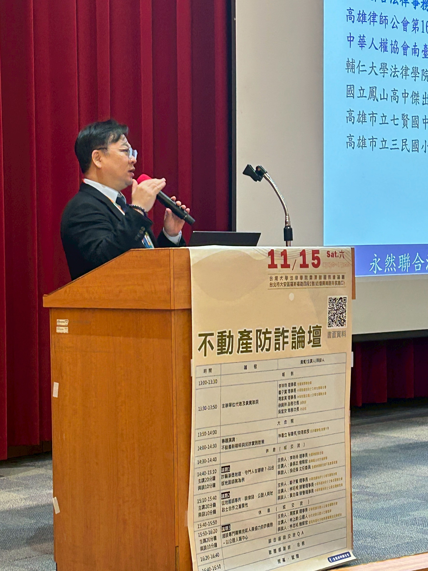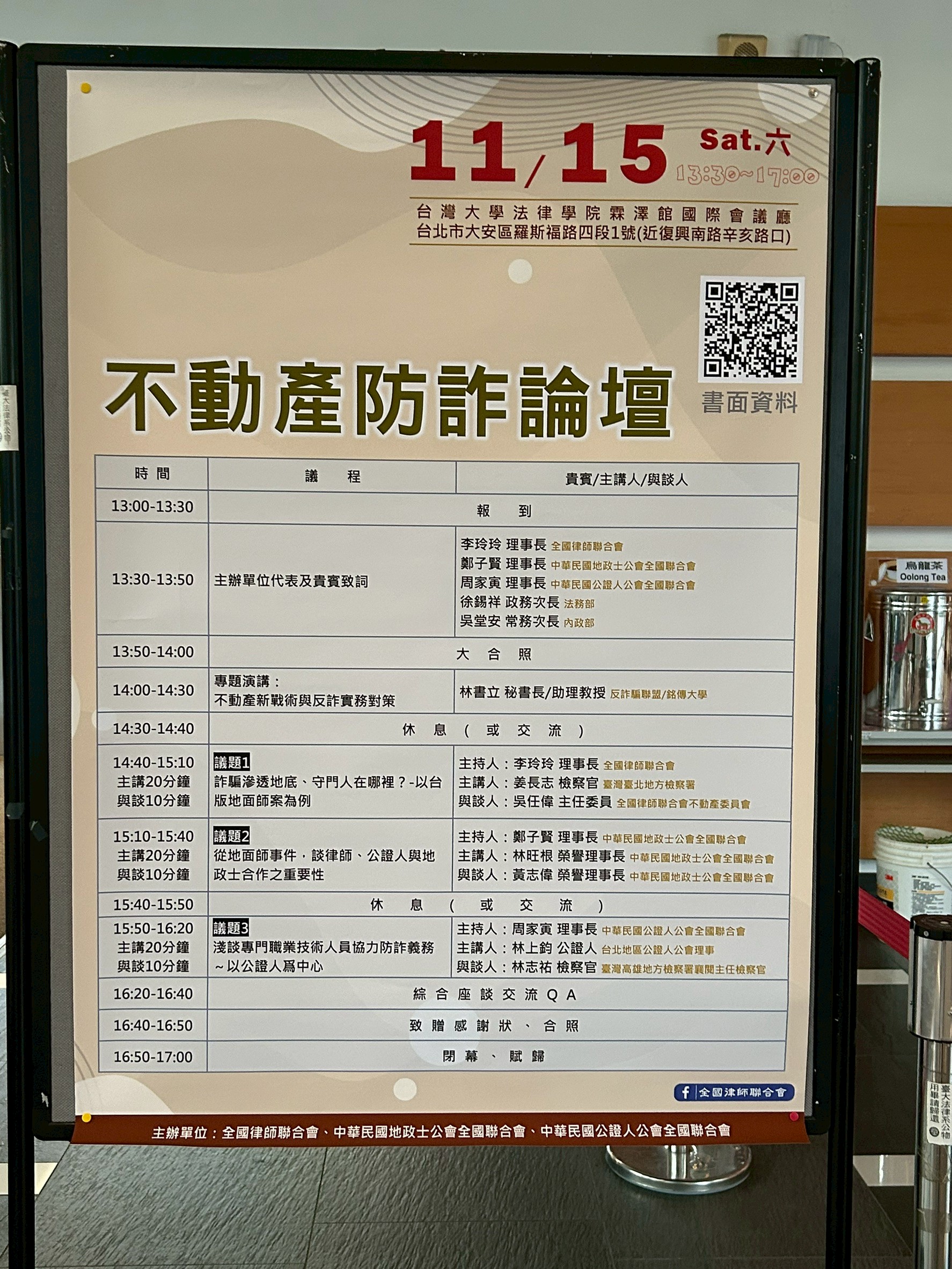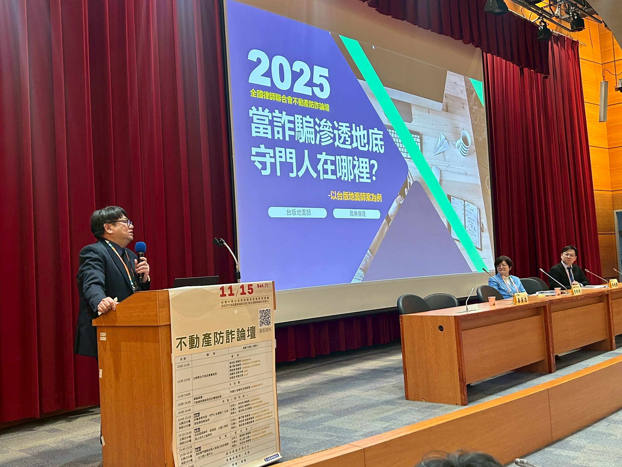 為響應政府不動產防詐政策,推展不動產安全防詐機制,深化自律、維持尊嚴、跨域合作促進互助且信賴的執業藍海,就本會不動產委員會所發起、本會與公證人全聯會及地政士公會全聯會於114年11月15日於臺灣大學法律學院共同主辦「不動產防詐論壇」,為我國律師、我國公證人、我國地政士就不動產防詐、為全民把關之跨域合作對話重要里程碑。