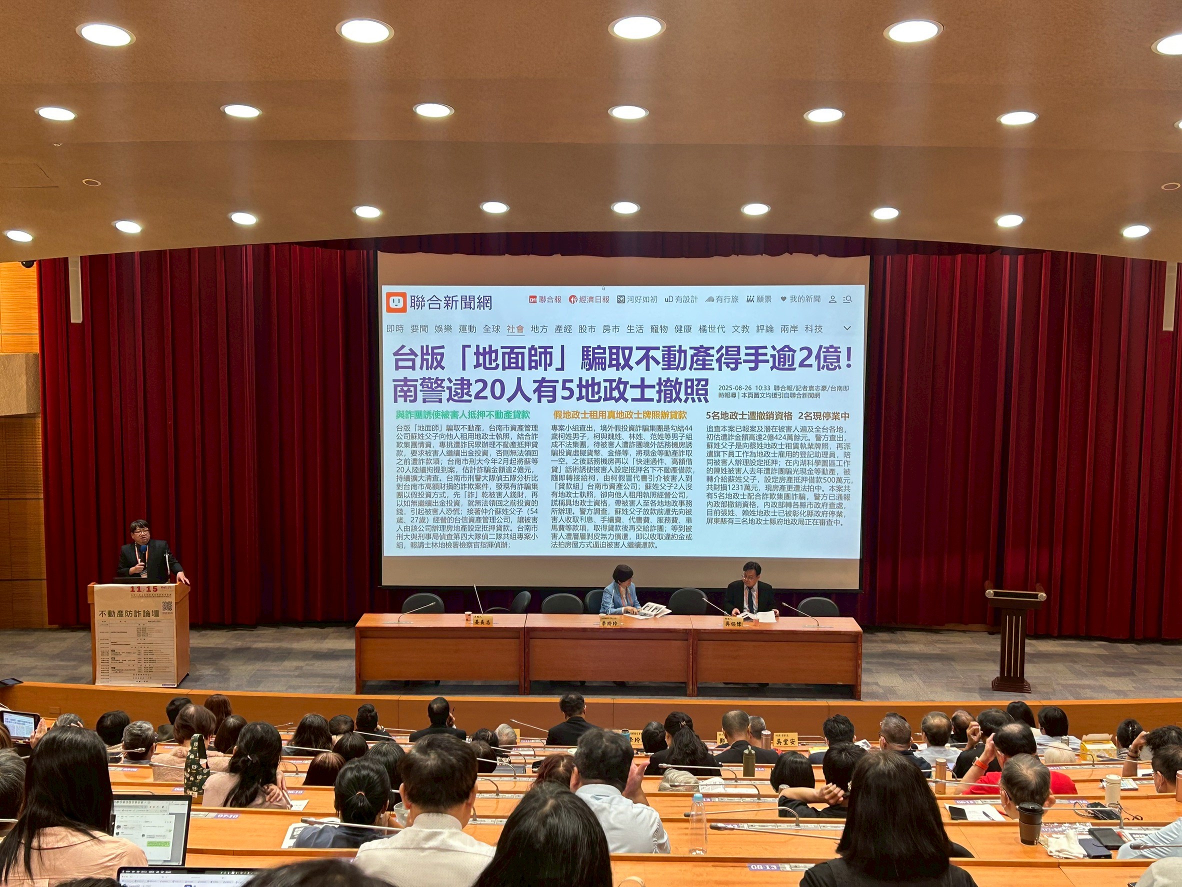 本次「不動產防詐論壇」由反詐騙聯盟協會秘書長暨銘傳大學犯罪防治學系林書立助理教授專題演講「不動產新戰術與反詐實務對策」,縱剖橫切跨國網路犯罪與詐騙趨勢,從現金、黃金到房地產、靈骨塔,綜觀全球詐騙趨勢,分析詐團運作機制、心理詐騙手法等,釐清不動產防詐所面臨之跨國挑戰關鍵。