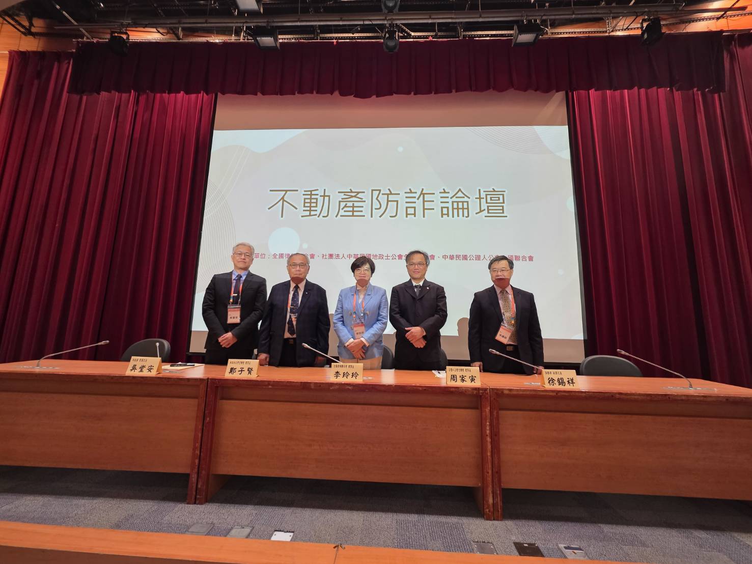 本次「不動產防詐論壇」由全國律師聯合會李玲玲理事長、地政士公會全聯會鄭子賢理事長、公證人全聯會周家寅理事長致詞揭開序幕,共同宣示我國律師、公證人、地政士將就不動產防詐透過跨領域之合作,一起為不動產安全防詐機制戮力為全民把關之決心。不動產防詐政策係我國政府之重要政策,本次「不動產防詐論壇」亦受我國政府機關高度重視,感謝法務部徐錫祥政務次長、內政部吳堂安常務次長蒞臨致詞。內政部地政司林家正司長、陳杰宗副司長、詐欺犯罪防制中心 張文源主任與地政司董婉蓉專員也到場與會致意。