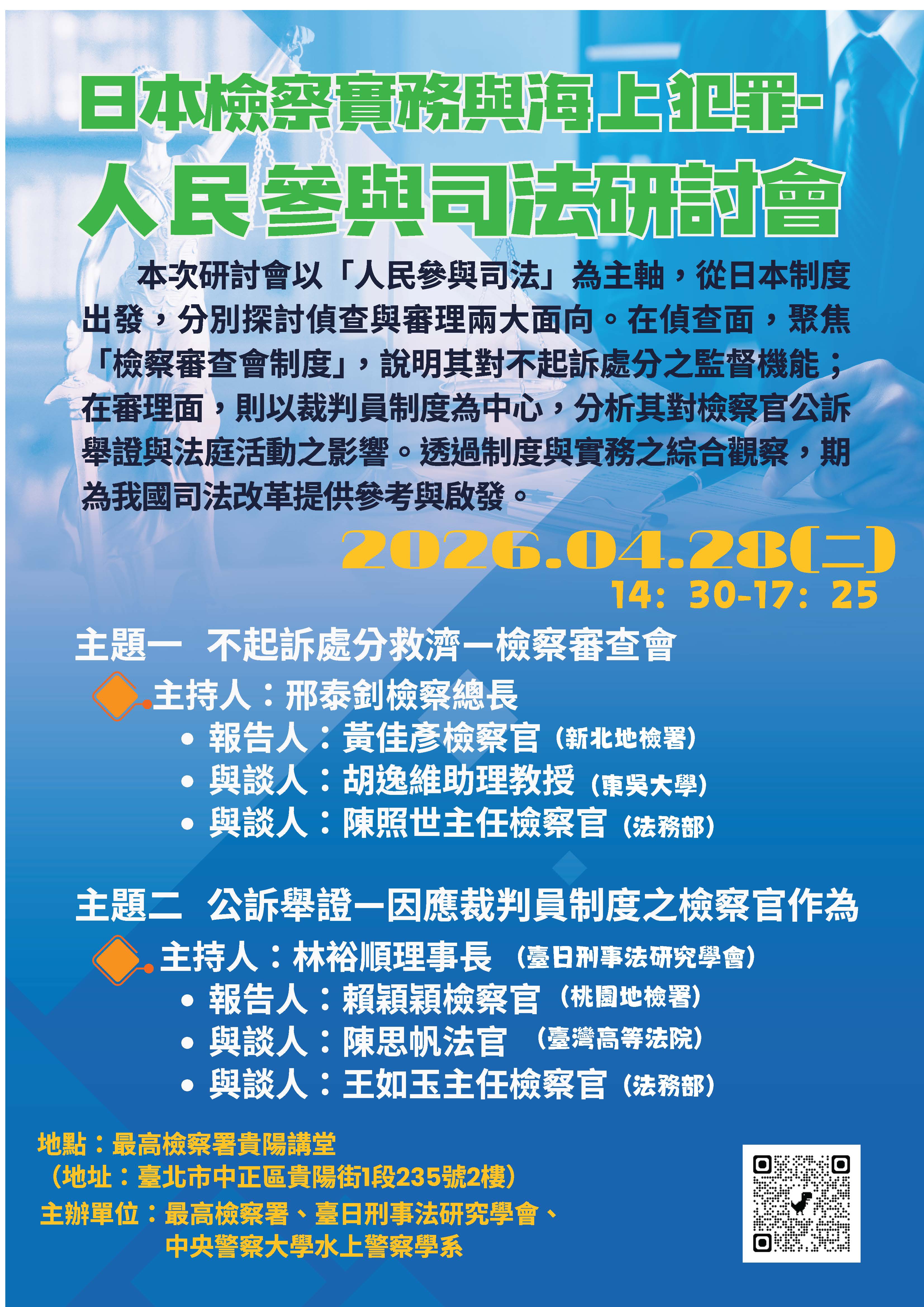 <會外課程>最高檢察署與臺日刑事法研究學會、中央警察大學水上警察學系115年4月28日(星期二)14:30「日本檢察實務與海上犯罪-人民參與司法」研討會