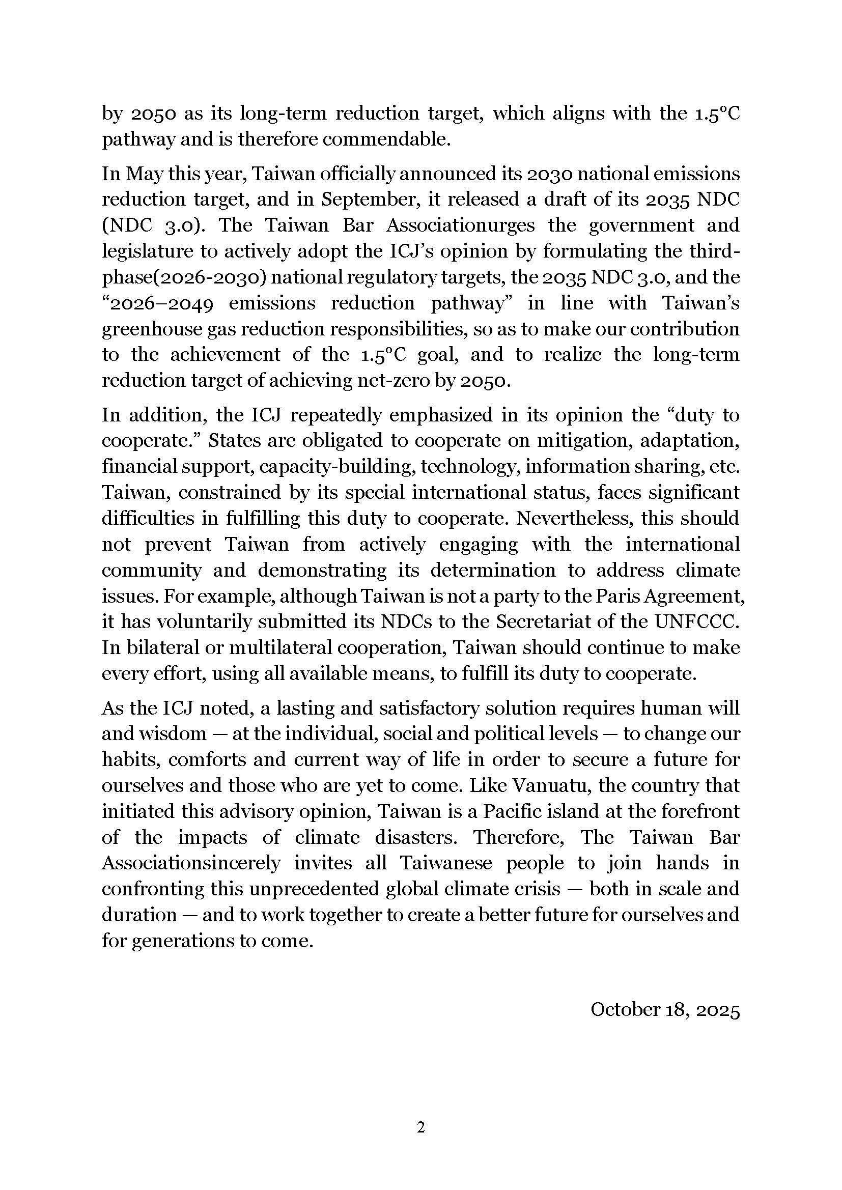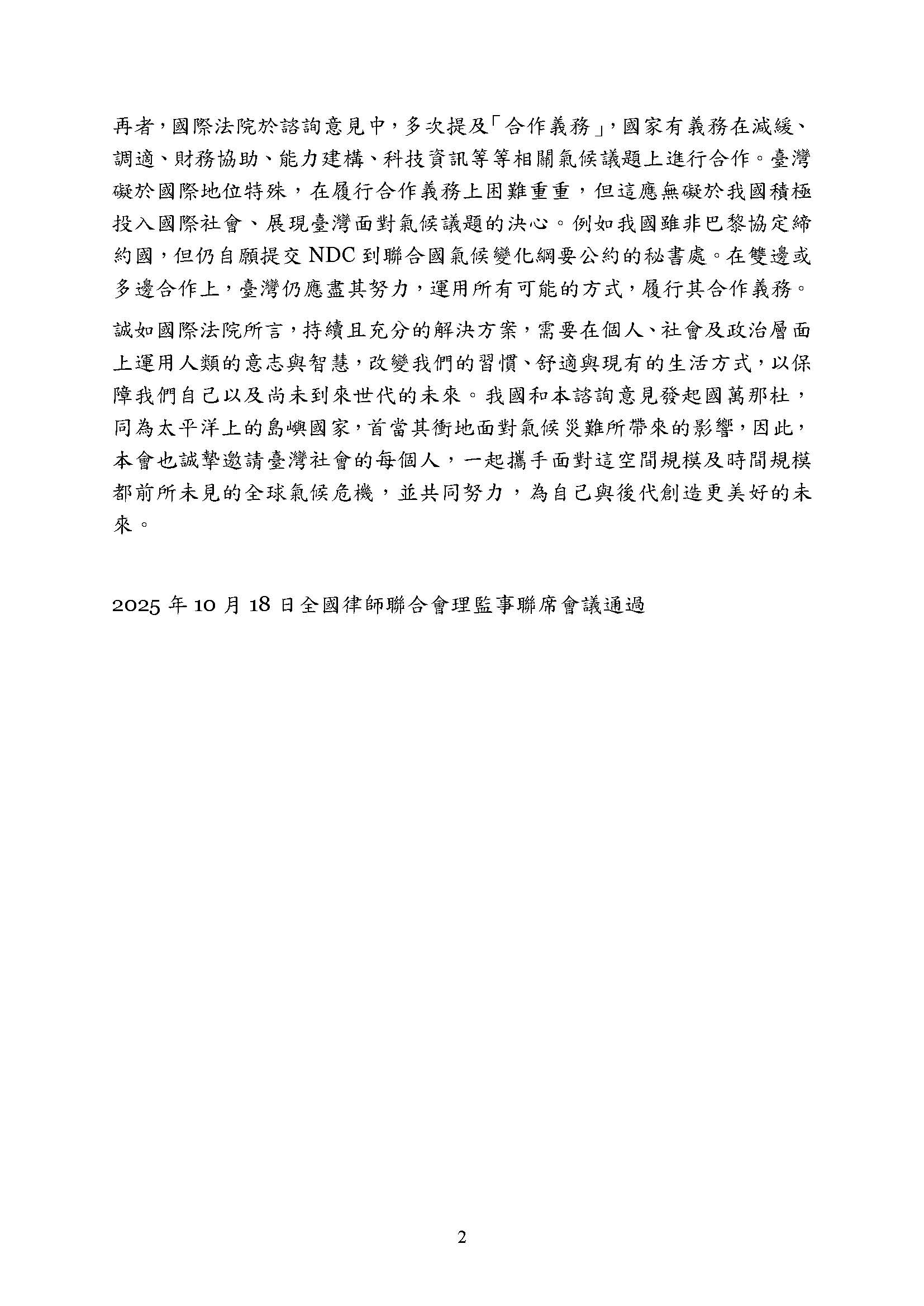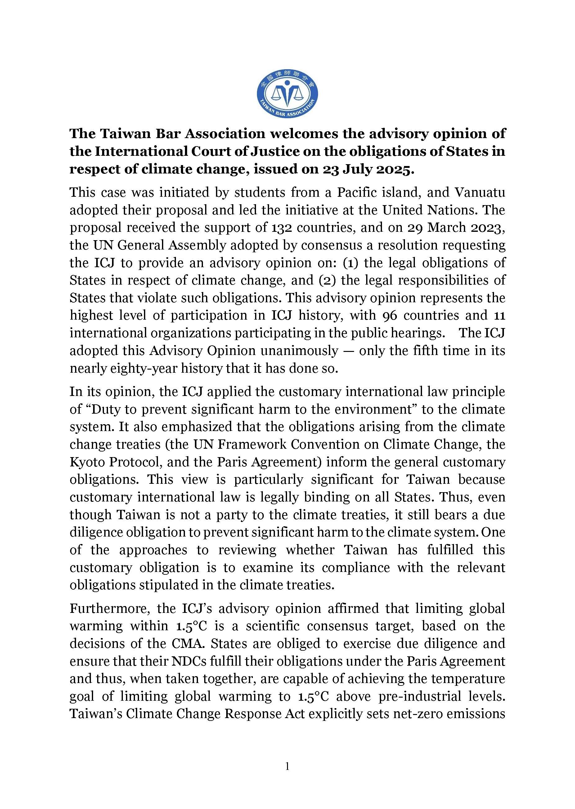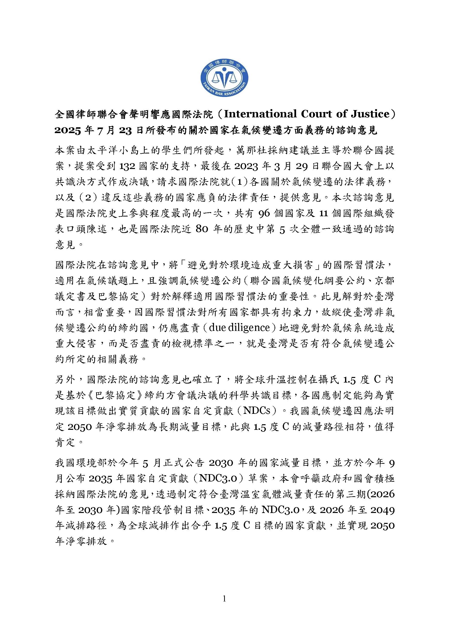 全國律師聯合會聲明響應國際法院(International Court of Justice)2025年7月23日所發布的關於國家在氣候變遷方面義務的諮詢意見
