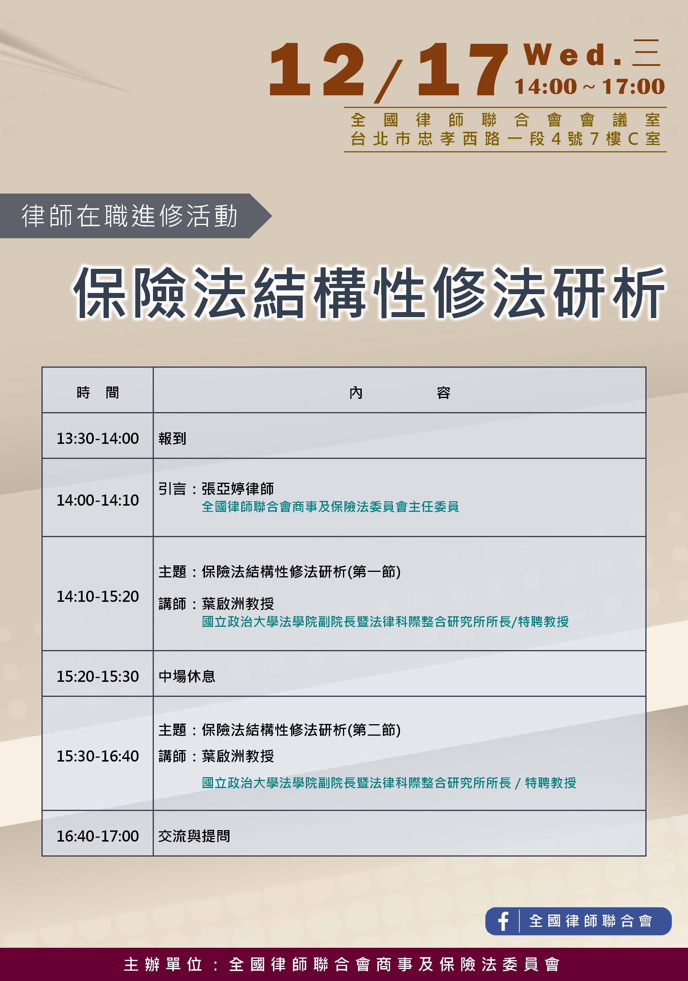 114年12月17日(星期三)律師在職進修活動:保險法結構性修法研析