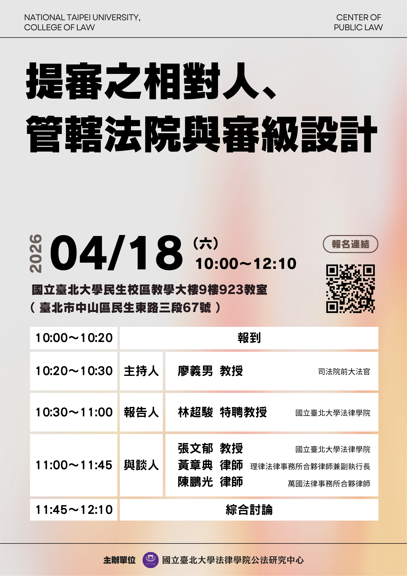 <會外課程>115年4月18日臺北大學公法中心「提審之相對人、管轄法院與審級設計」研討會資訊