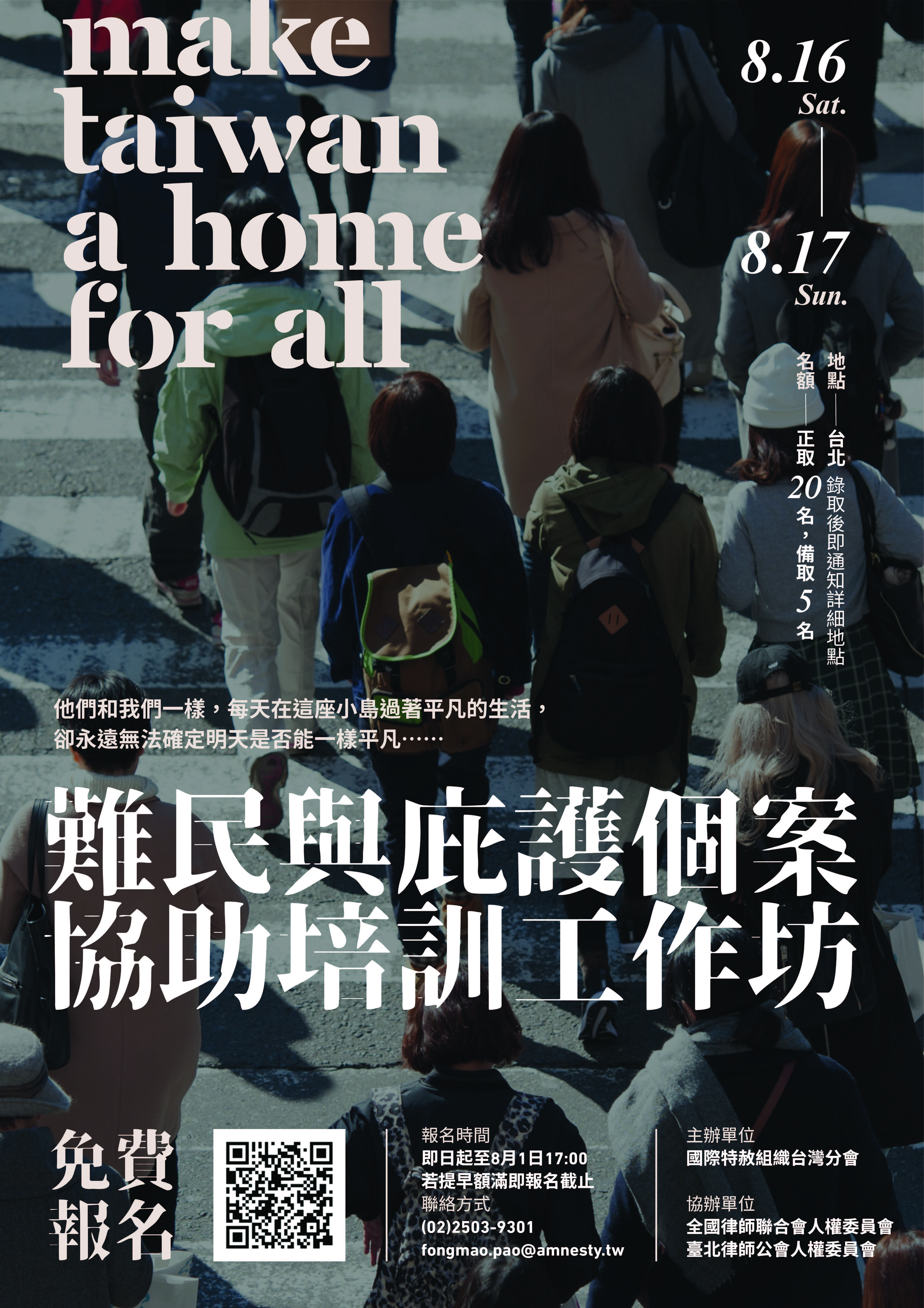 本會人權委員會與國際特赦組織臺灣分會、台北律師公會人權委員會定於114年8月16日至17日合辦「難民與庇護個案協助培訓工作坊」,由國內外資深庇護律師、國際人權法專家與資深難民庇護實務工作者授課,從理論和實務兩種面向切入難民協助議題,讓會員熟悉協助在臺難民的流程,歡迎踴躍報名。