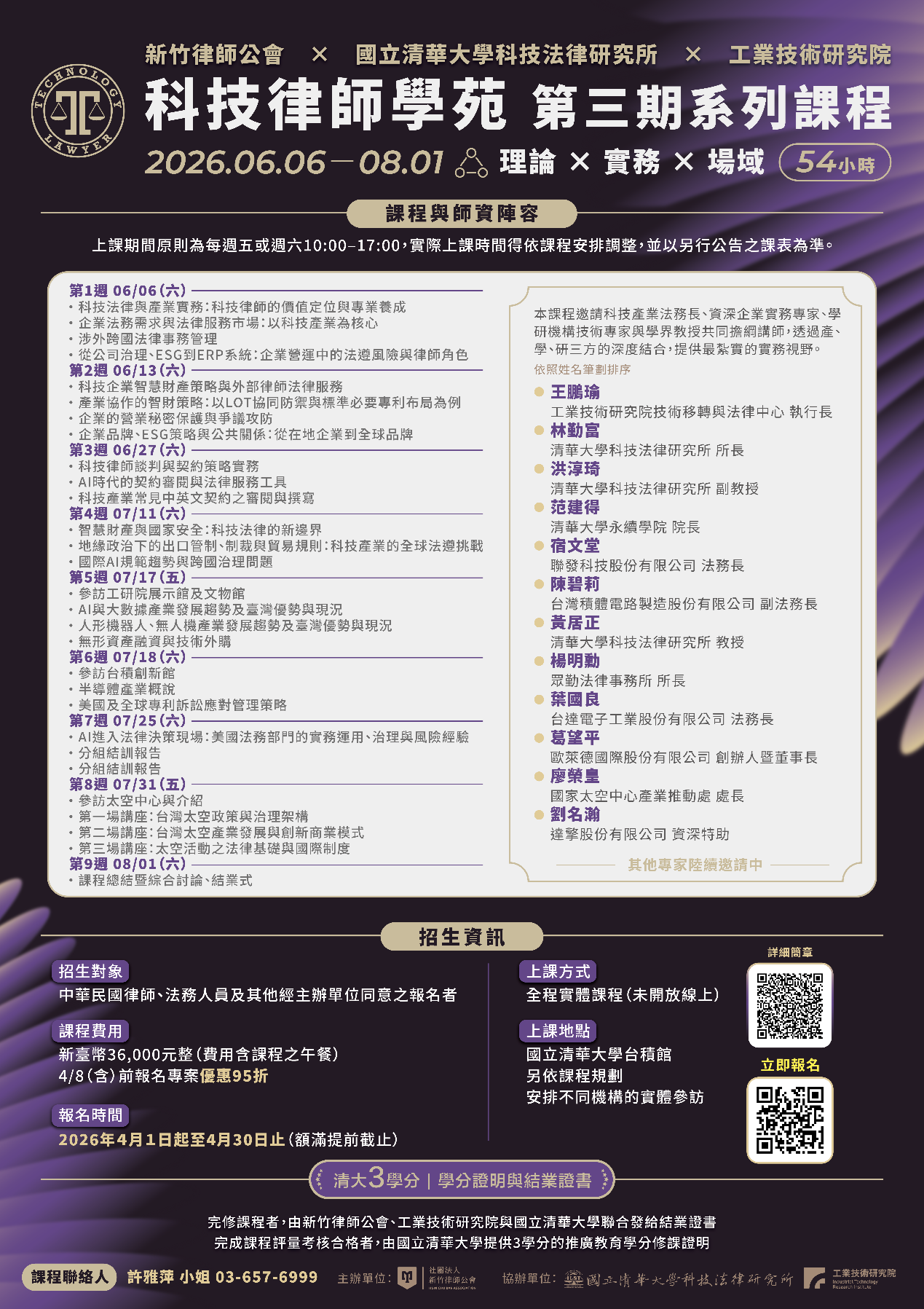 課程延續產學研各界資源,匯集科技產業法務長、資深實務專家、技術專家與學界教授共同擔任講師,旨在建立最紮實的實務視野,以精準回應新興科技產業之法律需求。
