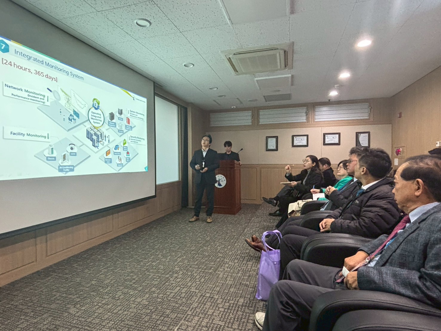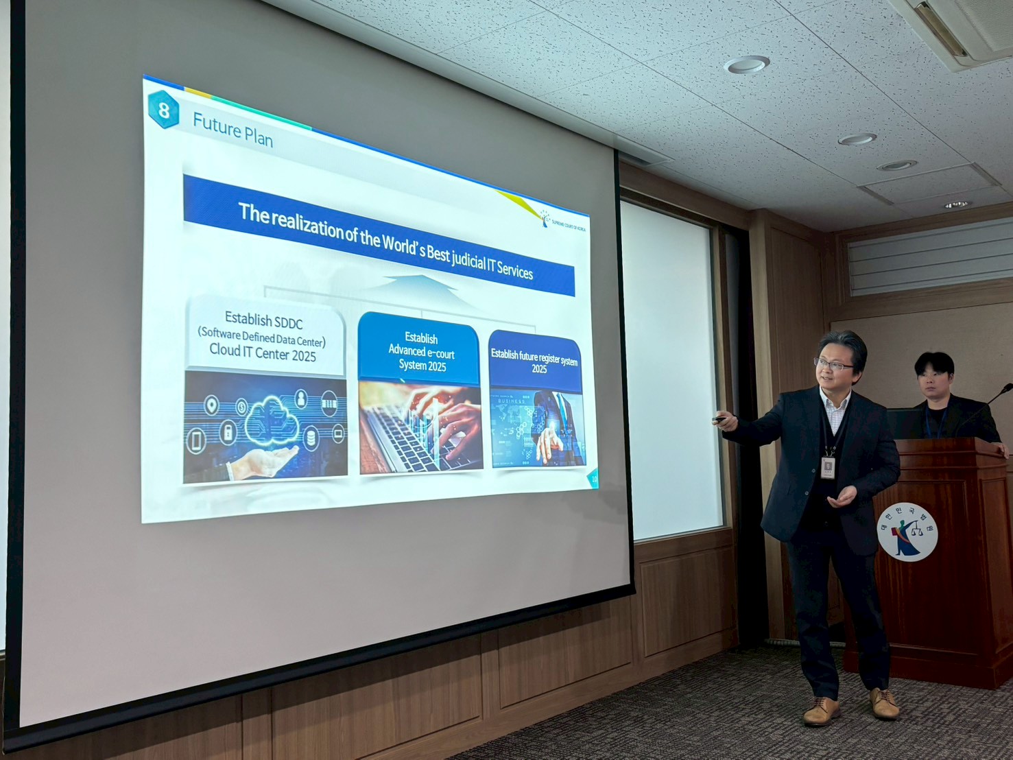 Yong 親自接待。韓方首先向本會介紹其司法電子化系統的整體架構與運作模式,並深入說明韓國法院如何透過完整的獨立資訊基礎建設,確保電子司法平台穩定、迅速且安全地運作。其後,韓方亦帶領本會代表團參觀監控室及設備區,使各成員能更直觀理解韓國法院電子資訊系統的實際運作情形。