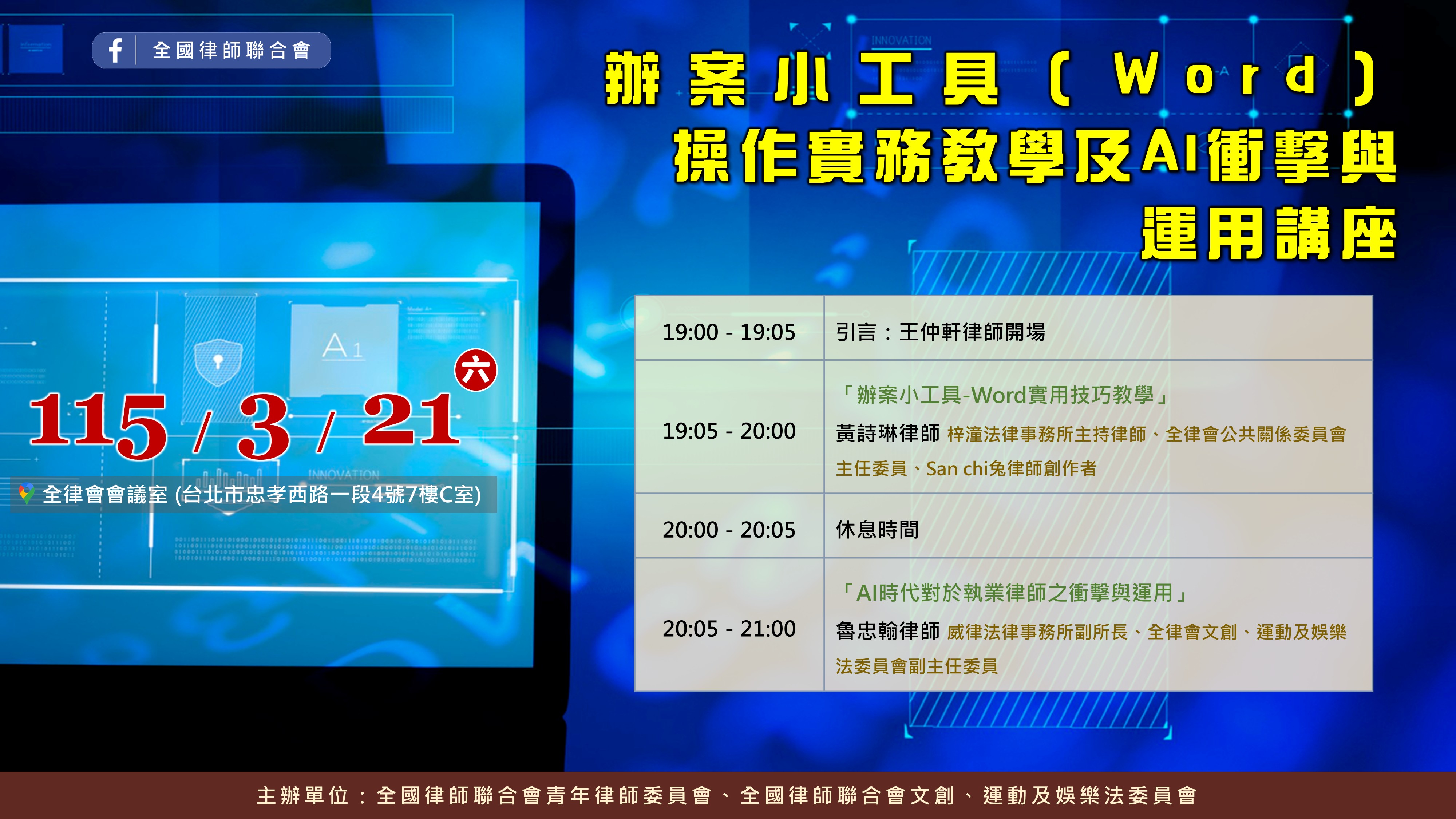 115年3月21日(星期六)「辦案小工具(Word)操作實務教學及AI衝擊與運用」講座,歡迎會員踴躍參加。
