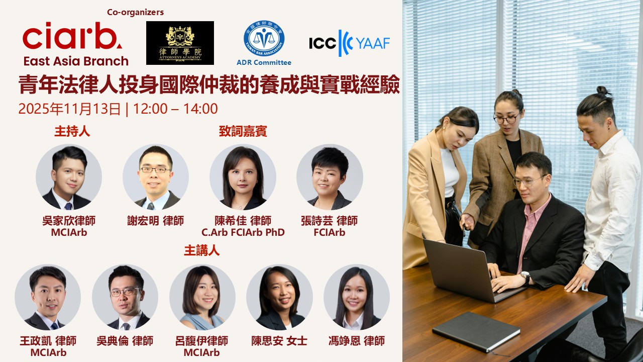 本會律師學院及ADR委員會、特許仲裁學會東亞分會臺灣支會青年事務委員會(Ciarb Taiwan YMG)、國際商會青年仲裁和ADR論壇(ICC YAAF)定於114年11月13日(星期四)合辦「青年法律人投身國際仲裁的養成與實戰經驗」研討會,敬請踴躍報名參加。