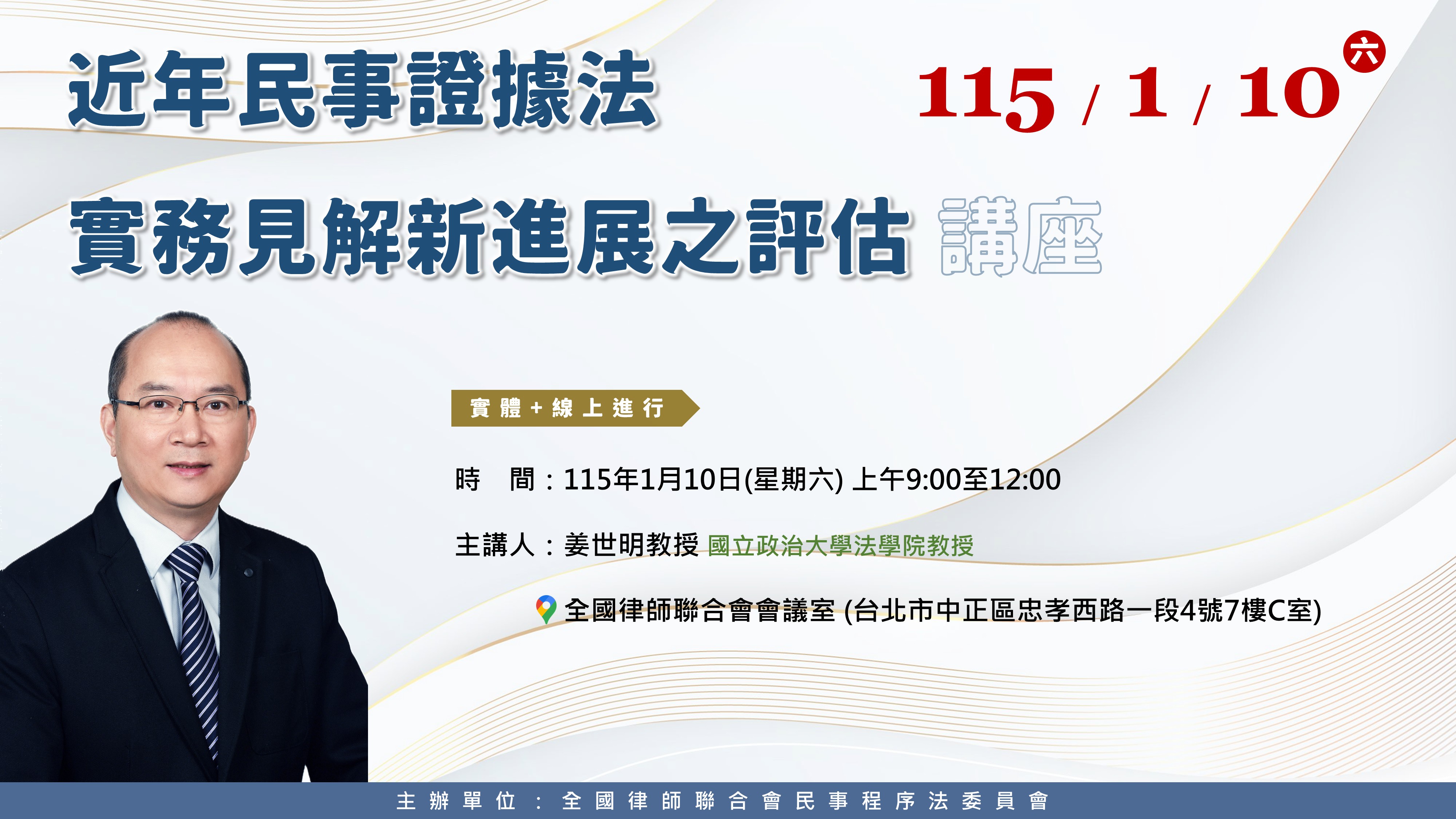 115年1月10日(星期六)「近年民事證據法實務見解新進展之評估」講座,歡迎會員踴躍參加。