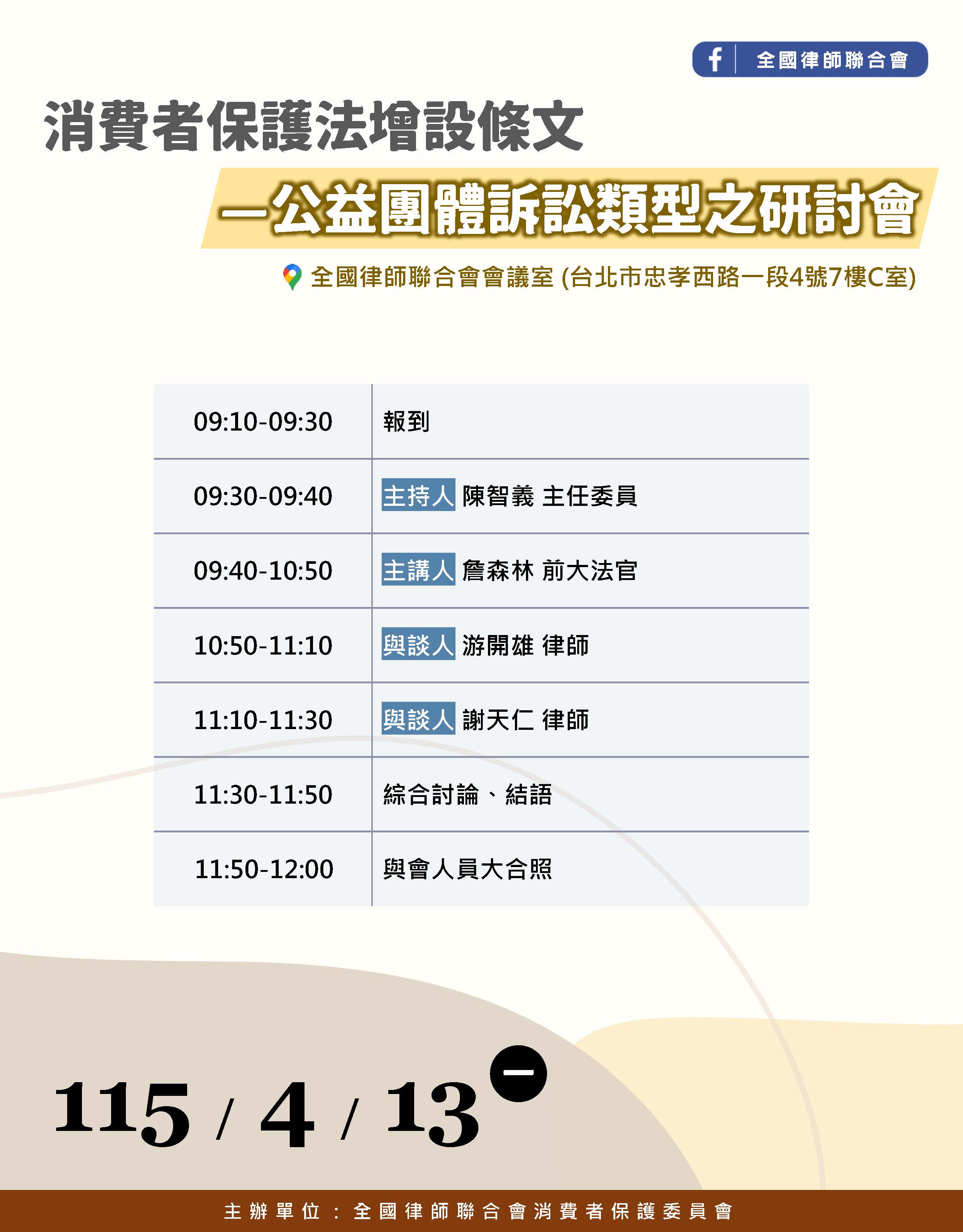 115年4月13日(星期一)「消費者保護法增設條文—公益團體訴訟類型之研討會」,歡迎會員踴躍參加。