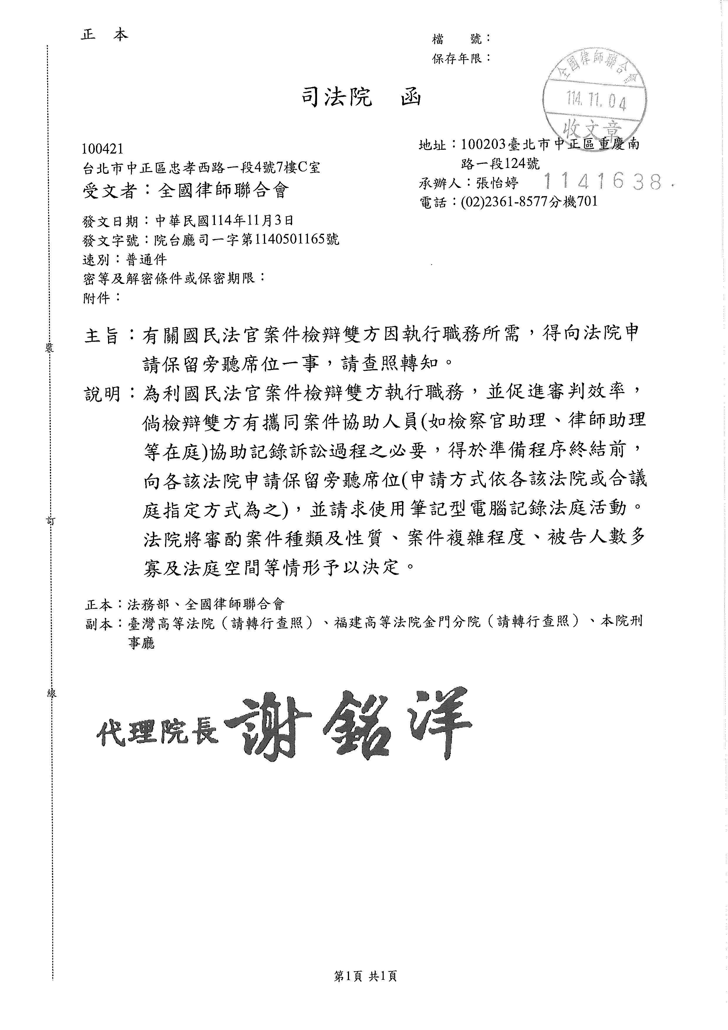 司法院函:有關國民法官案件檢辯雙方因執行職務所需,得向法院申請保留旁聽席位一事