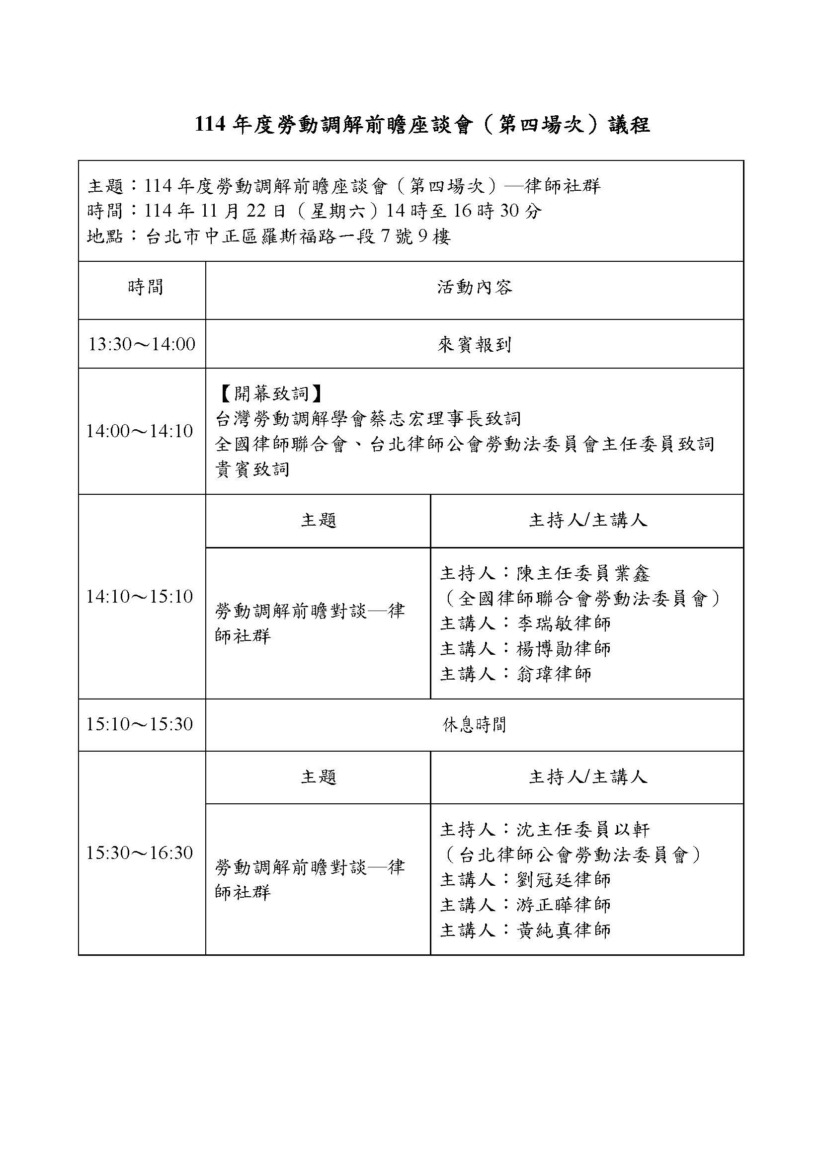 一、主辦單位:全國律師聯合會、台北律師公會、台灣勞動調解學會