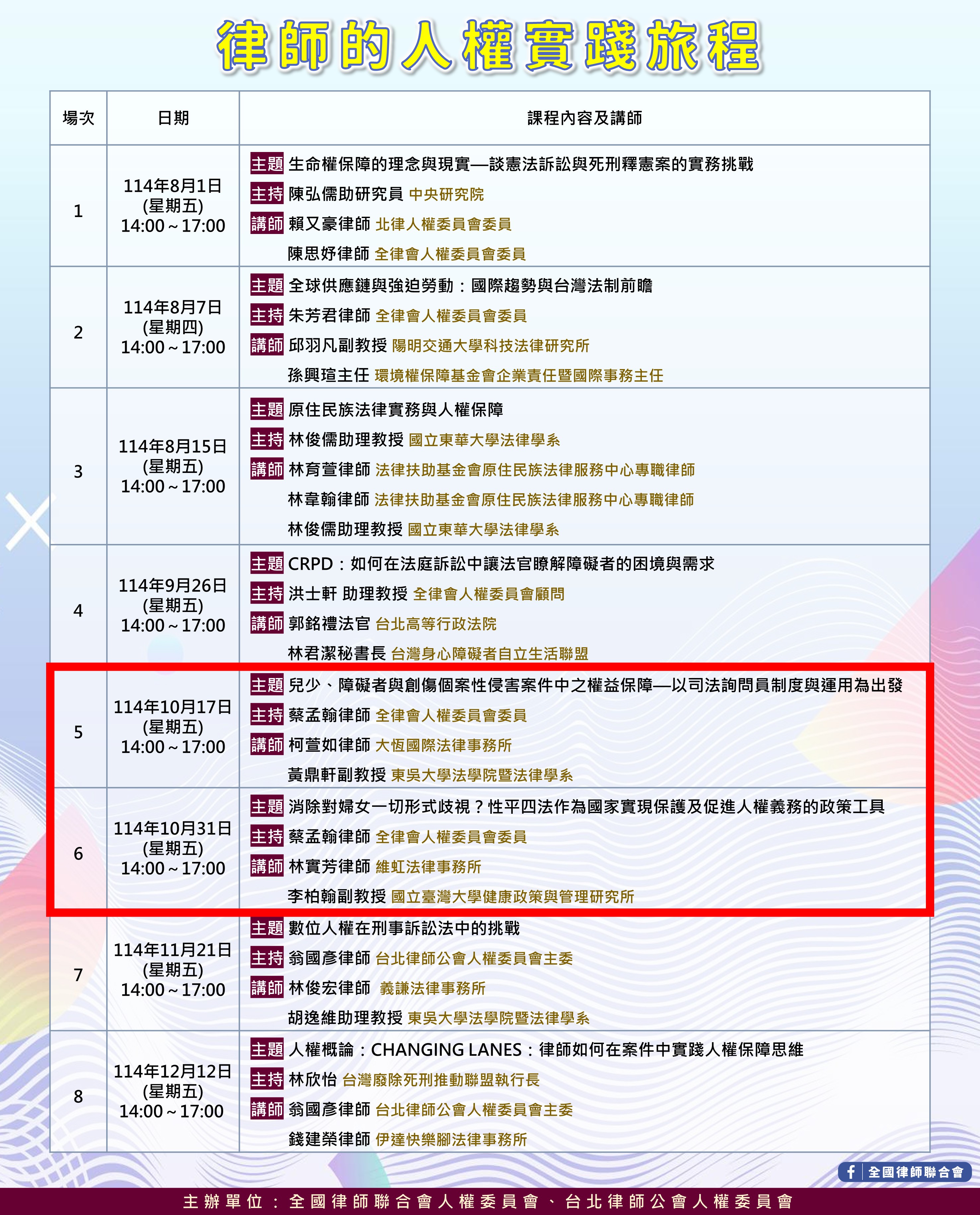 114年10月17日及31日「律師的人權實踐旅程」系列課程,歡迎會員踴躍參加。