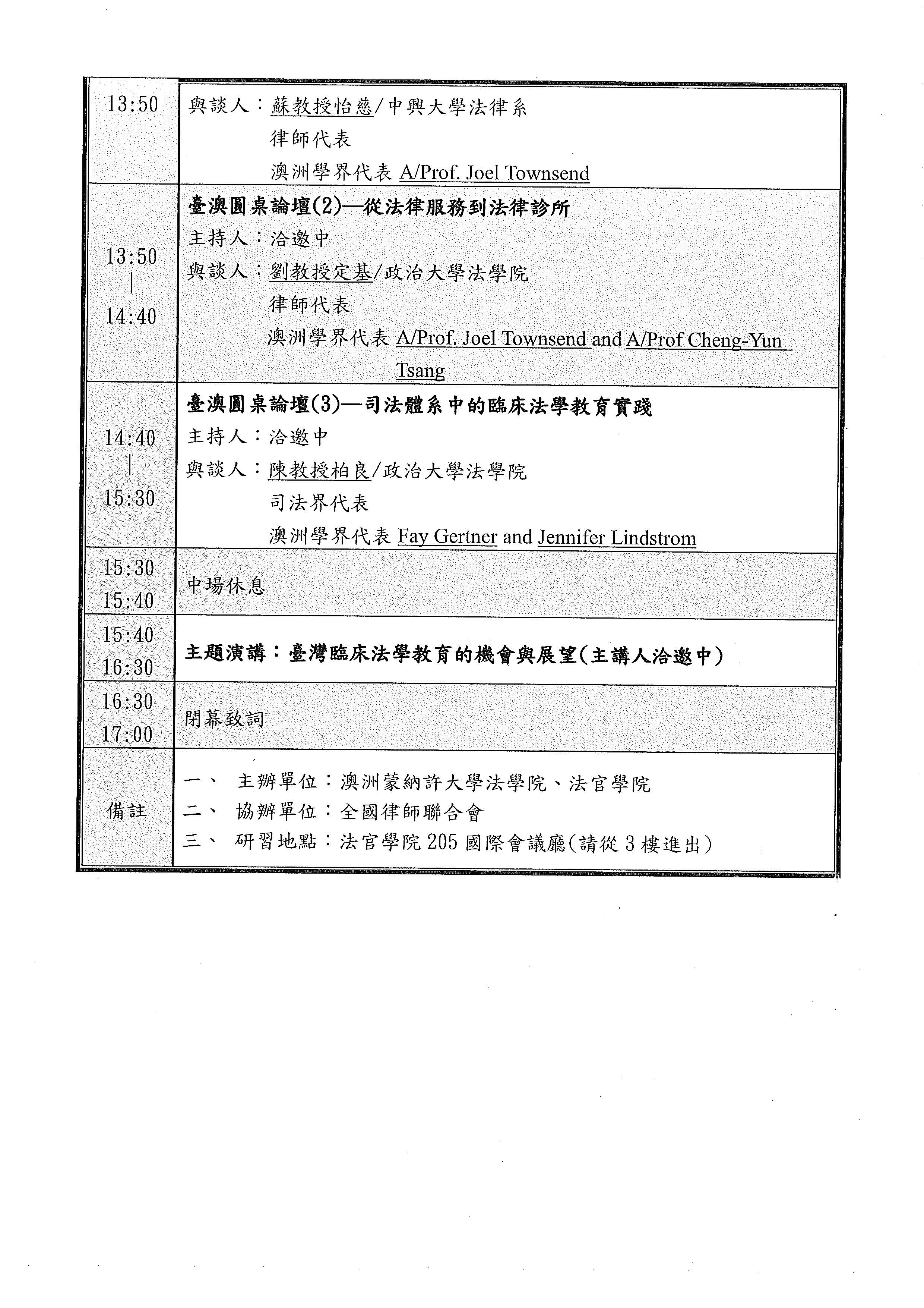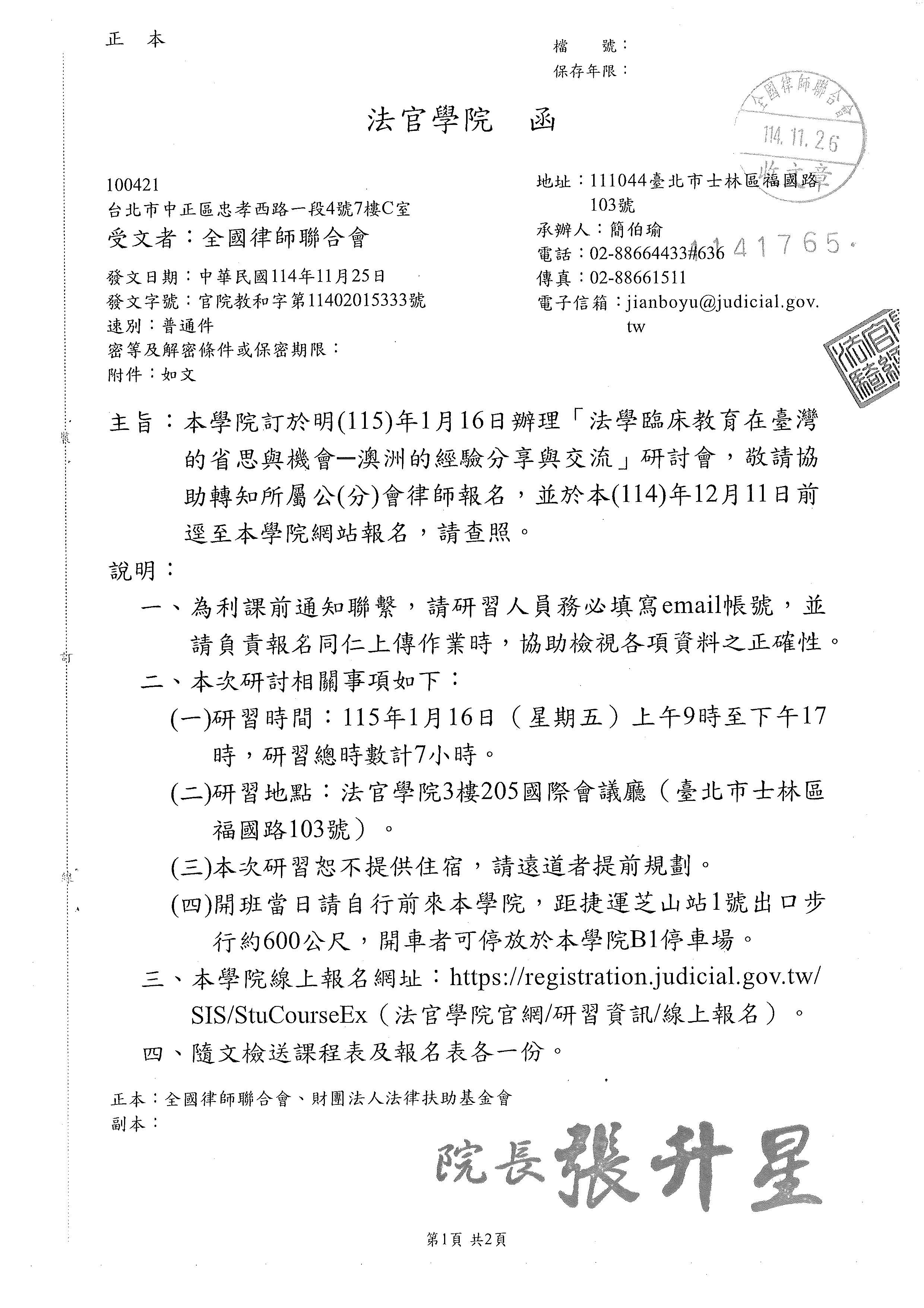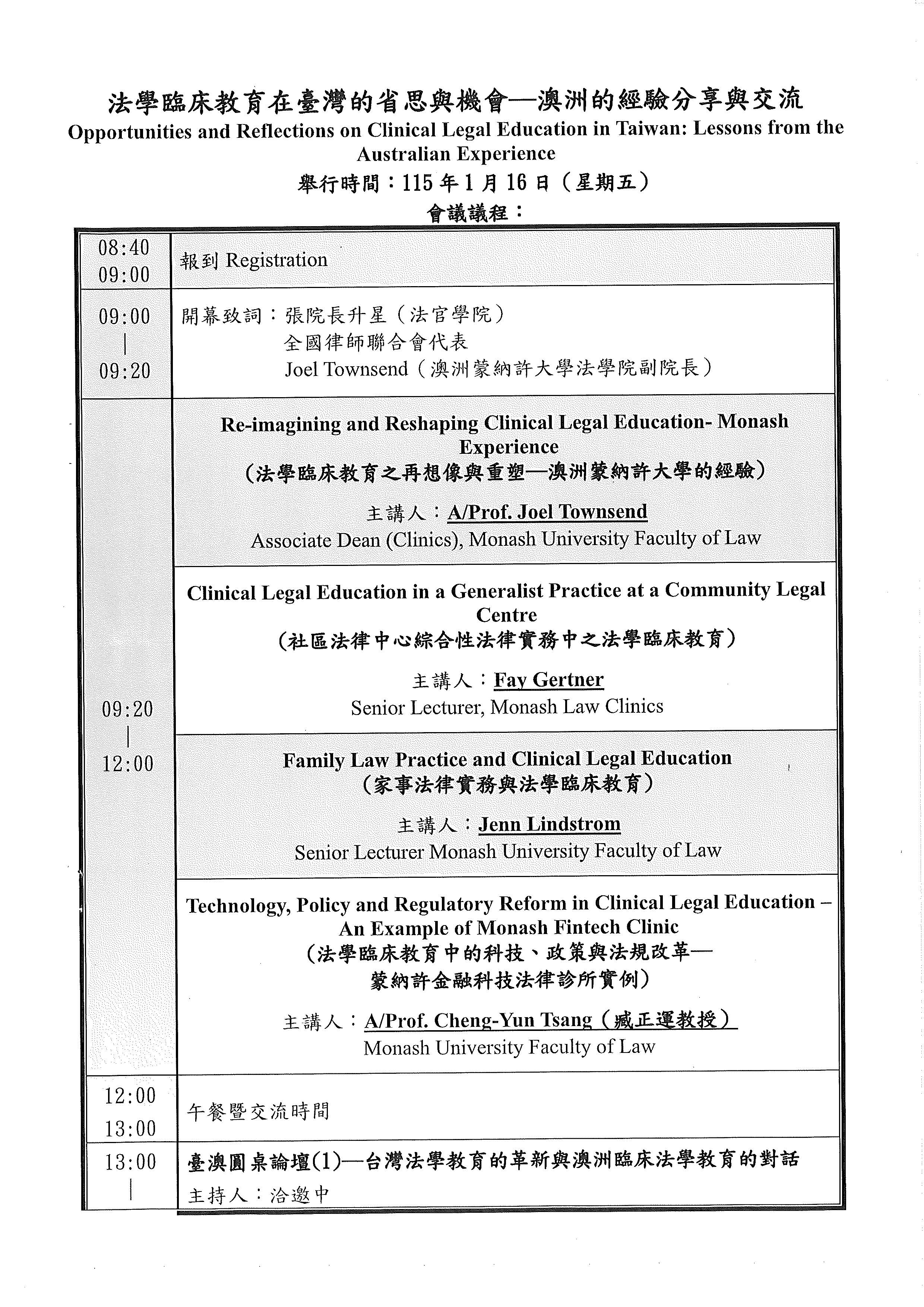115年1月16日法官學院「法學臨床教育在台灣的省思與機會- 澳洲的經驗分享與交流」,歡迎會員踴躍報名