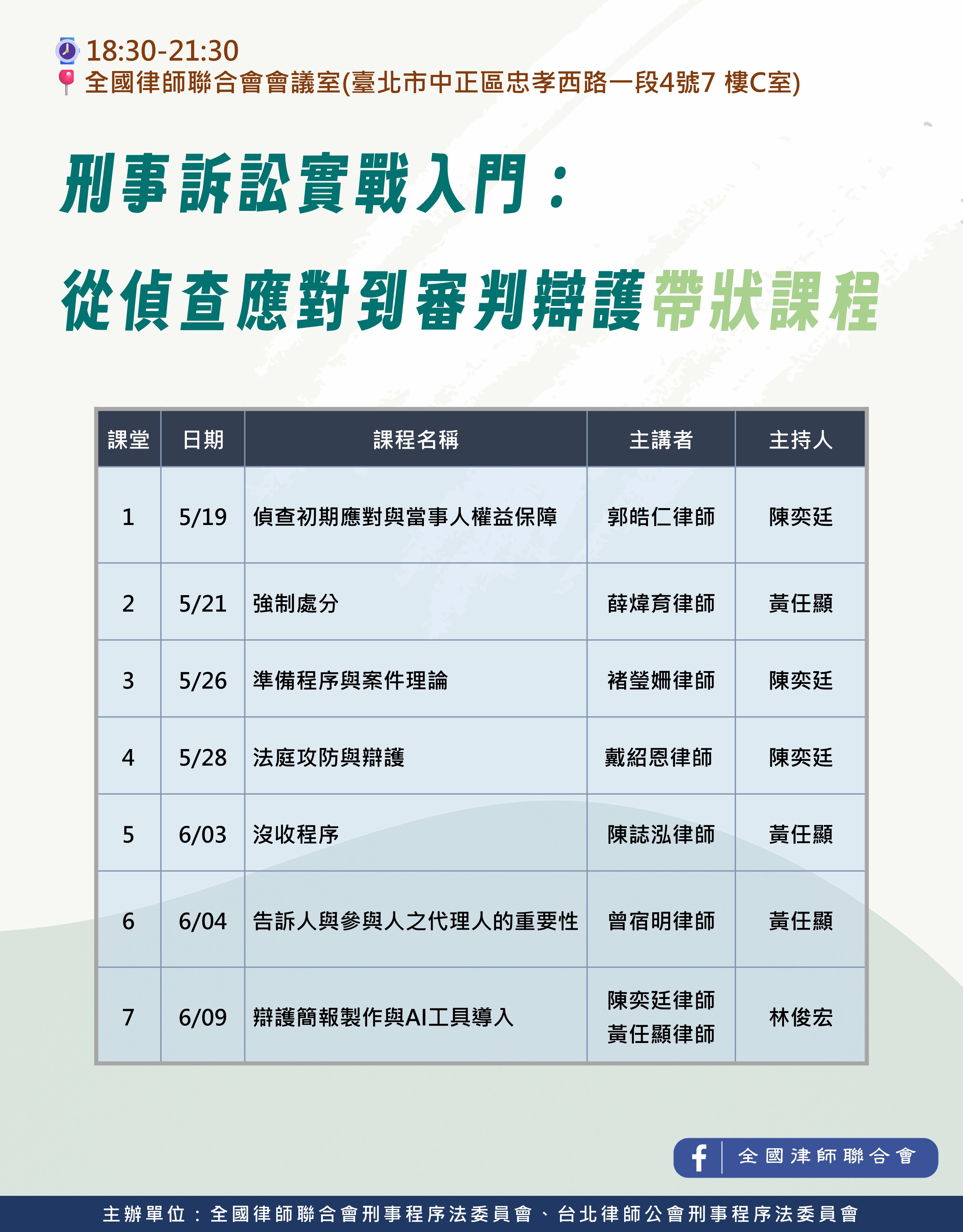 由於律師在執業現場,經常面臨程序節點密集、攻防節奏快速、卷證龐雜而需即時判斷之情形,然現行進修課程多偏向單點式主題分享,較少有依刑事程序推進脈絡進行系統性規劃者,有鑑於此,特規劃本帶狀課程,依刑事案件實務流程與不同角色功能,邀請具備豐富實務經驗之律師擔任講師,透過帶狀方式,有系統地協助會員掌握刑事程序各階段之操作重點、風險辨識及實務攻防方法,歡迎會員踴躍參加。