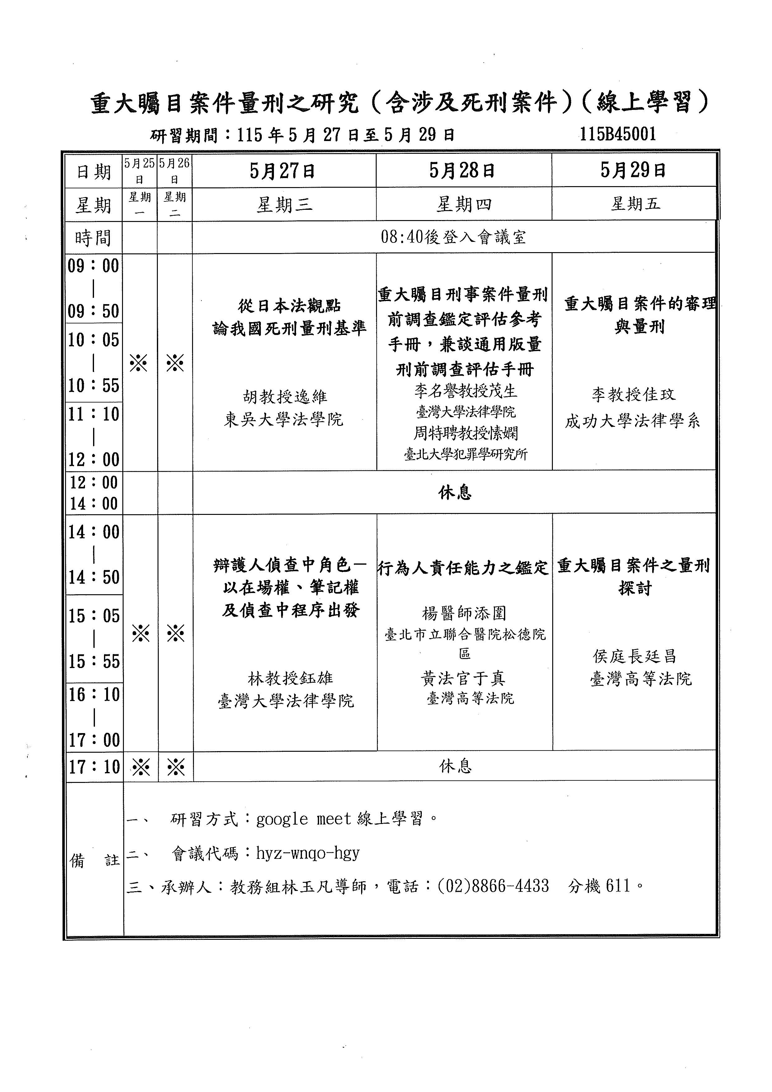 <會外課程>法官學院115年5月27日至29日「重大矚目案件量刑之研究(含涉及死刑案件)(線上學習)」