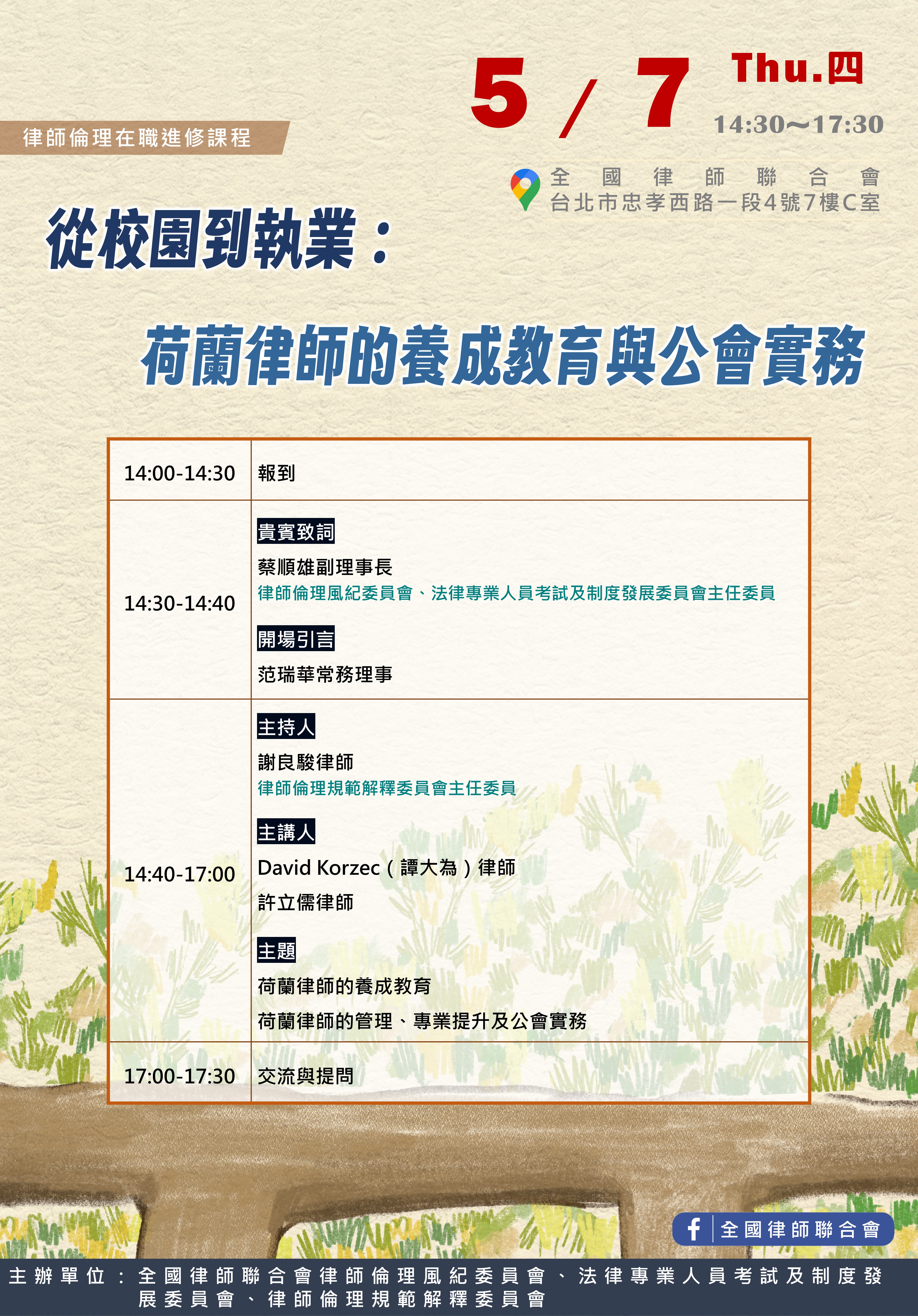115年5月7日(星期四)「從校園到執業:荷蘭律師的養成教育與公會實務」在職進修課程,歡迎會員踴躍報名。