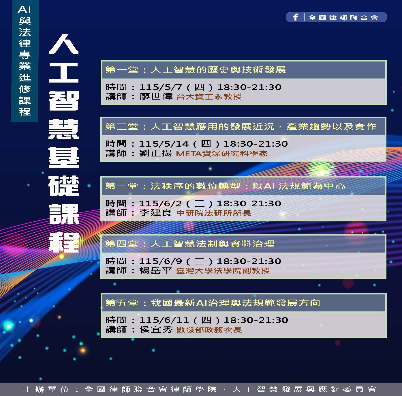 1.本課程為人工智慧(AI)與法律專業進修課程「基礎核心課程:人工智慧導論」之12小時必修時數。未取得本會開設的必修課程時數,無法取得人工智慧(AI)與法律專業進修課程認證。
