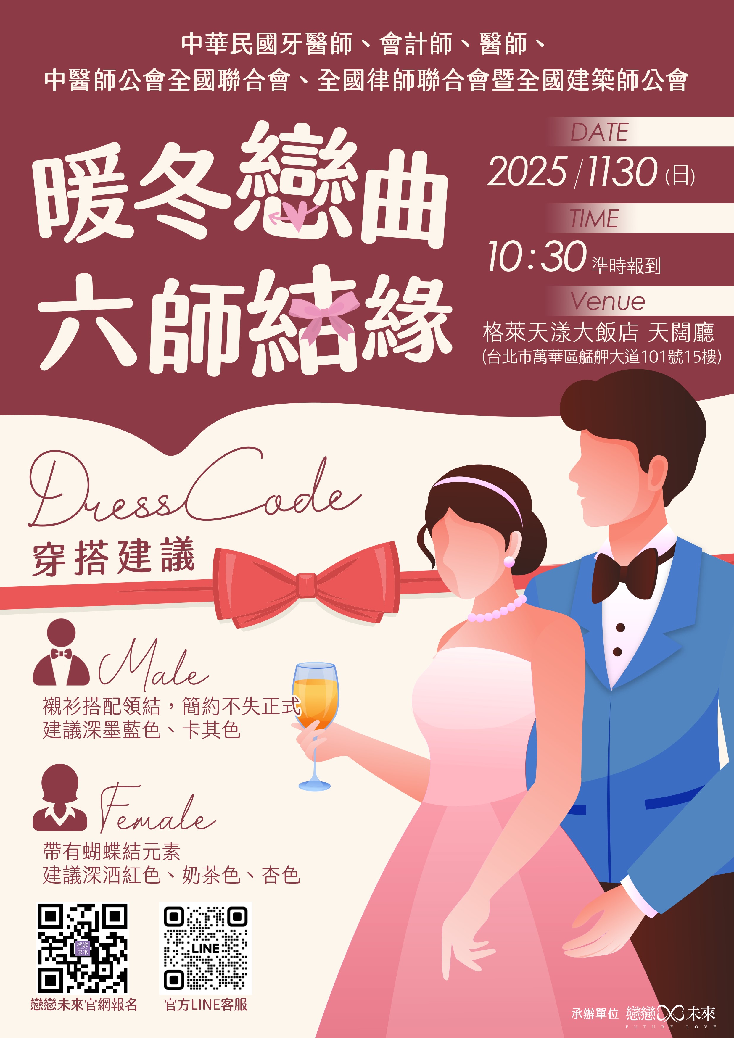 中華民國醫師公會全國聯合會、中華民國牙醫師公會全國聯合會、中華民國會計師公會全國聯合會、中華民國中醫師公會全國聯合會、全國律師聯合會、中華民國全國建築師公會六師聯誼會114年「暖冬戀曲.六師結緣」