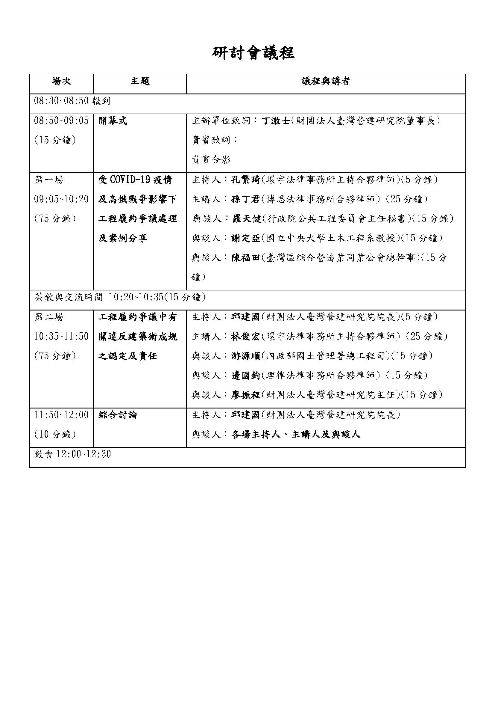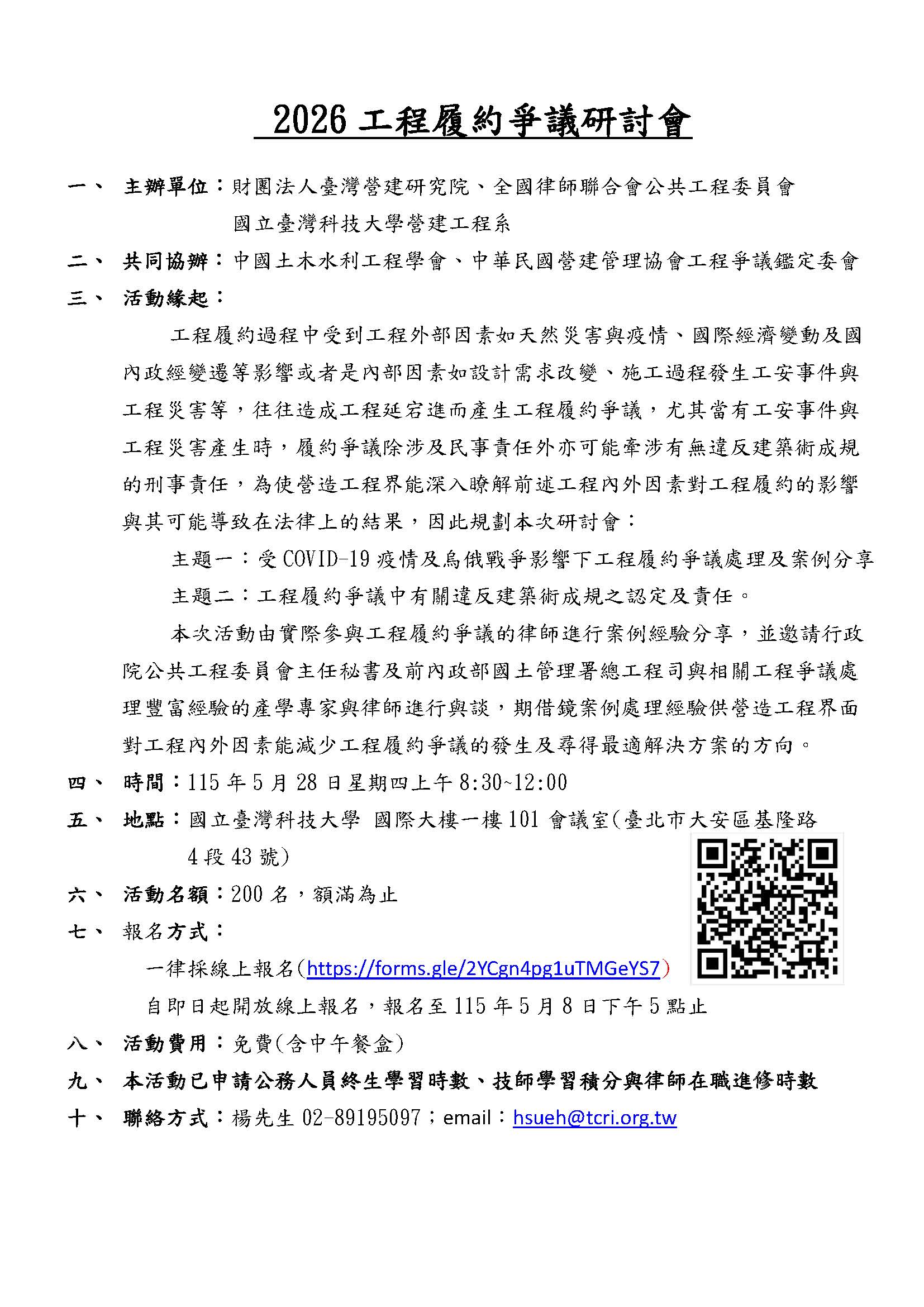 115年5月28日(星期四)本會公共工程委員會與財團法人臺灣營建研究院、國立臺灣科技大學營建工程系共同主辦「2026工程履約爭議研討會」,歡迎會員踴躍參加。