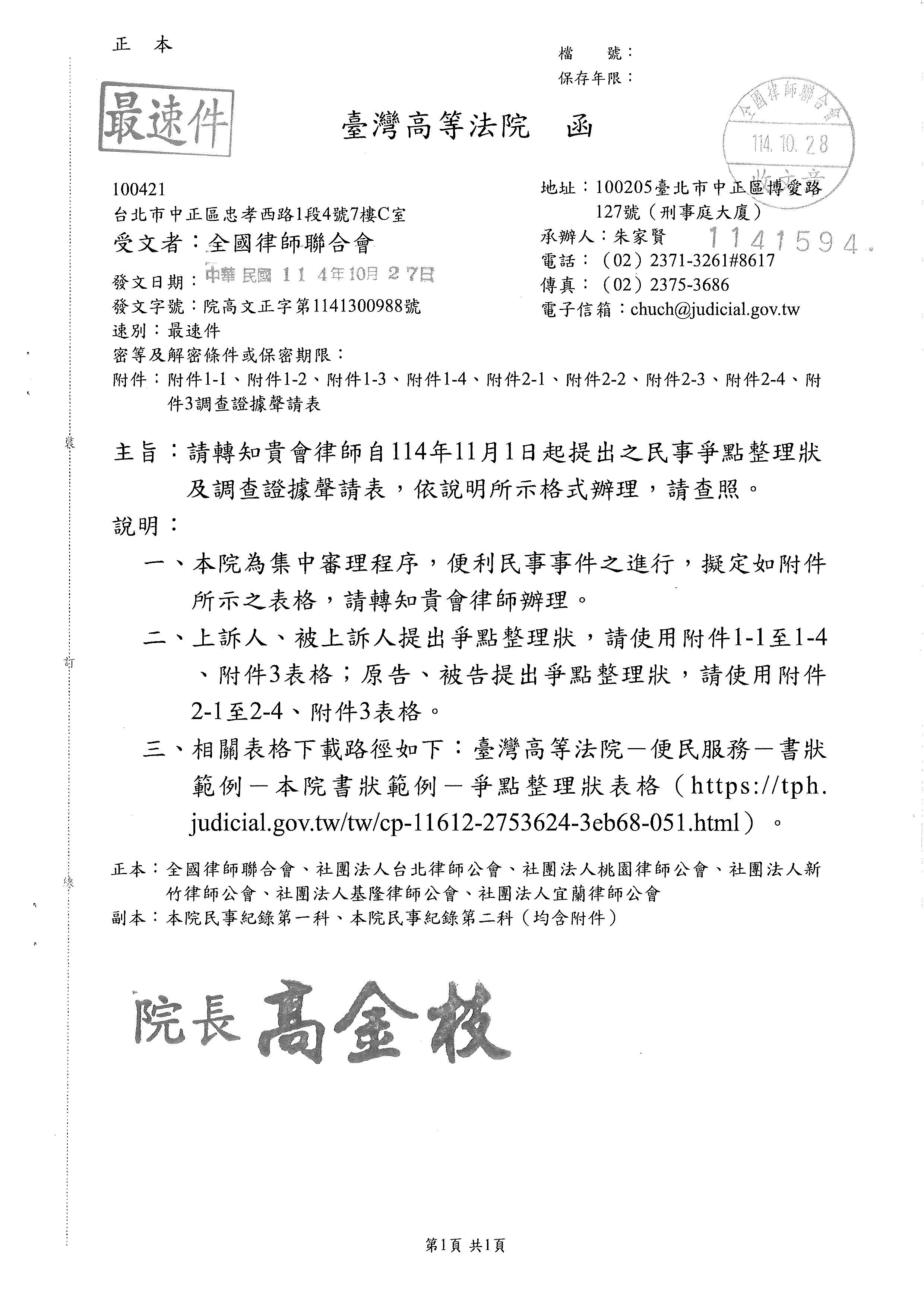 臺灣高等法院函:自114年11月1日起提出之民事爭點整理狀及調查證據聲請表,依說明所示格式辦理。