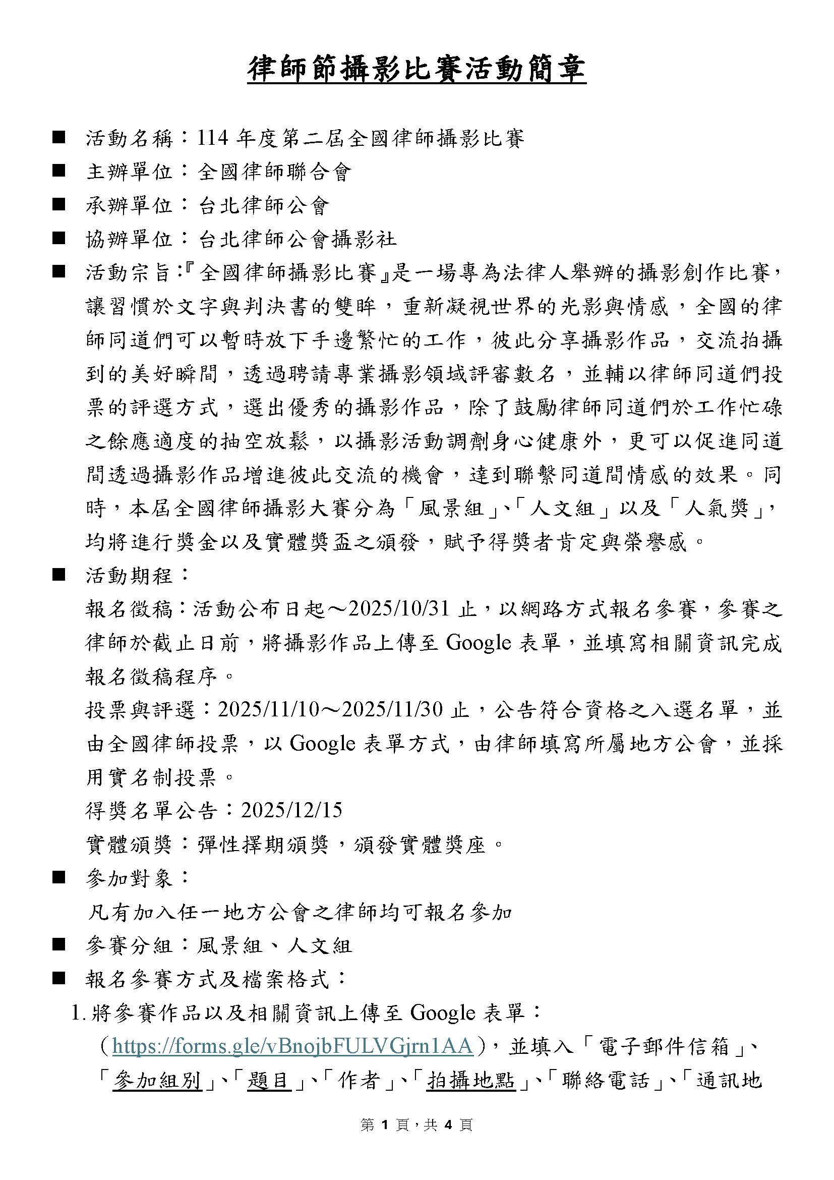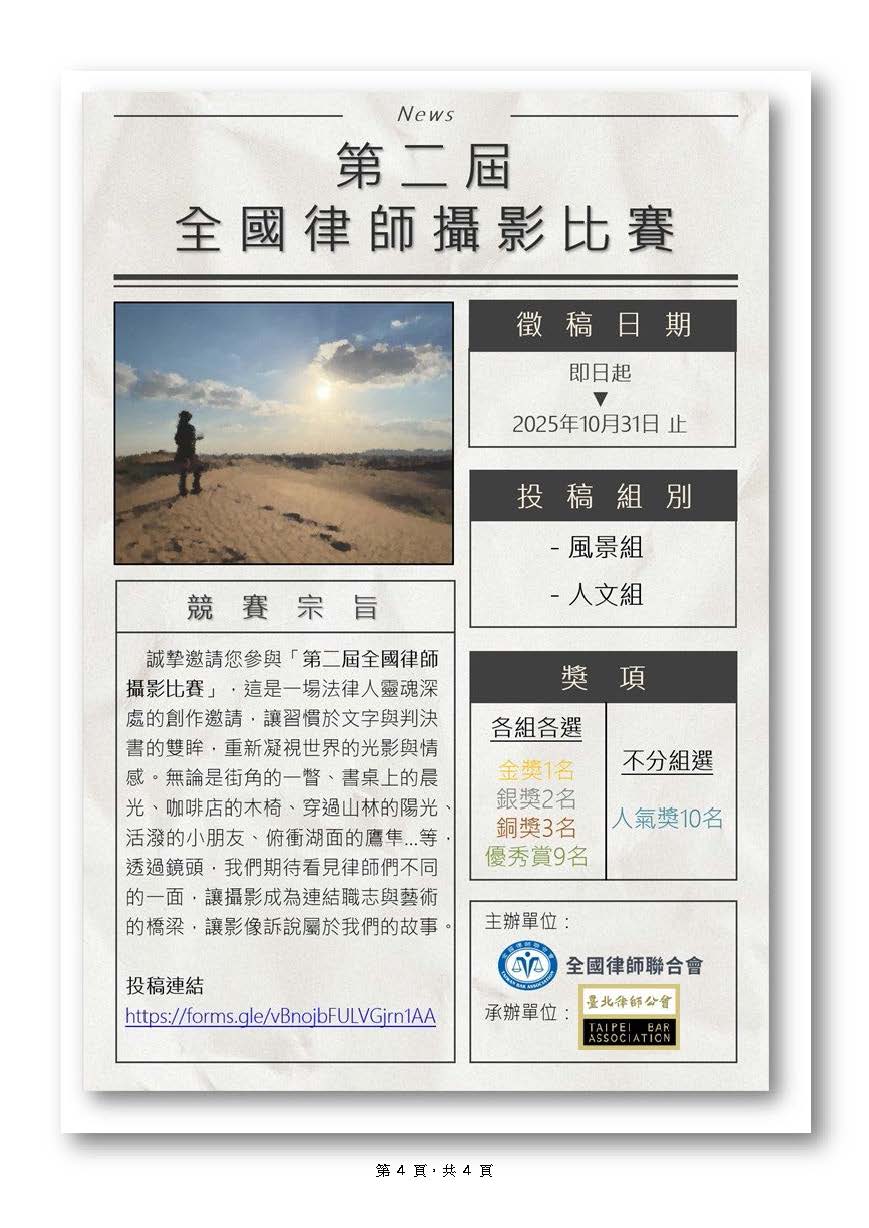 2.上傳之參賽作品照片檔案請使用 jpeg 檔案格式,需在 1,800 個像素寬(水平照片),或 1,800 個像素高(垂直照片)以上,彩色或黑白不拘,手機拍攝或相機拍攝皆可,但不得為空拍或生成式AI 生成之照片。