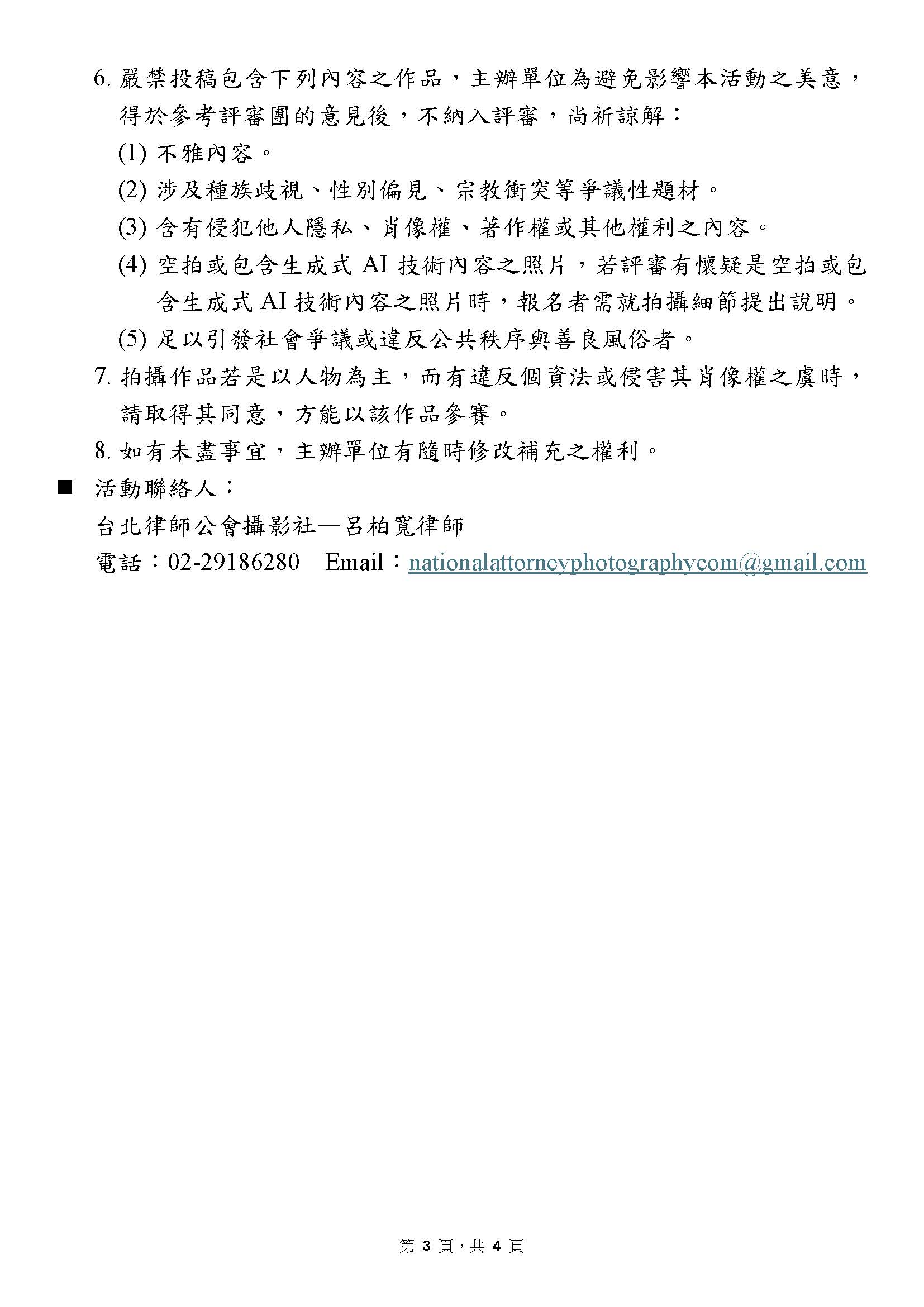 3.參賽作品可以裁切、調整照片長寬比率,亦可為求符合拍攝創作構想而適度調整曝光、對比、飽和度及色彩,但不可以軟體添加原本照片不存在之元素或刪去原本照片之內容。