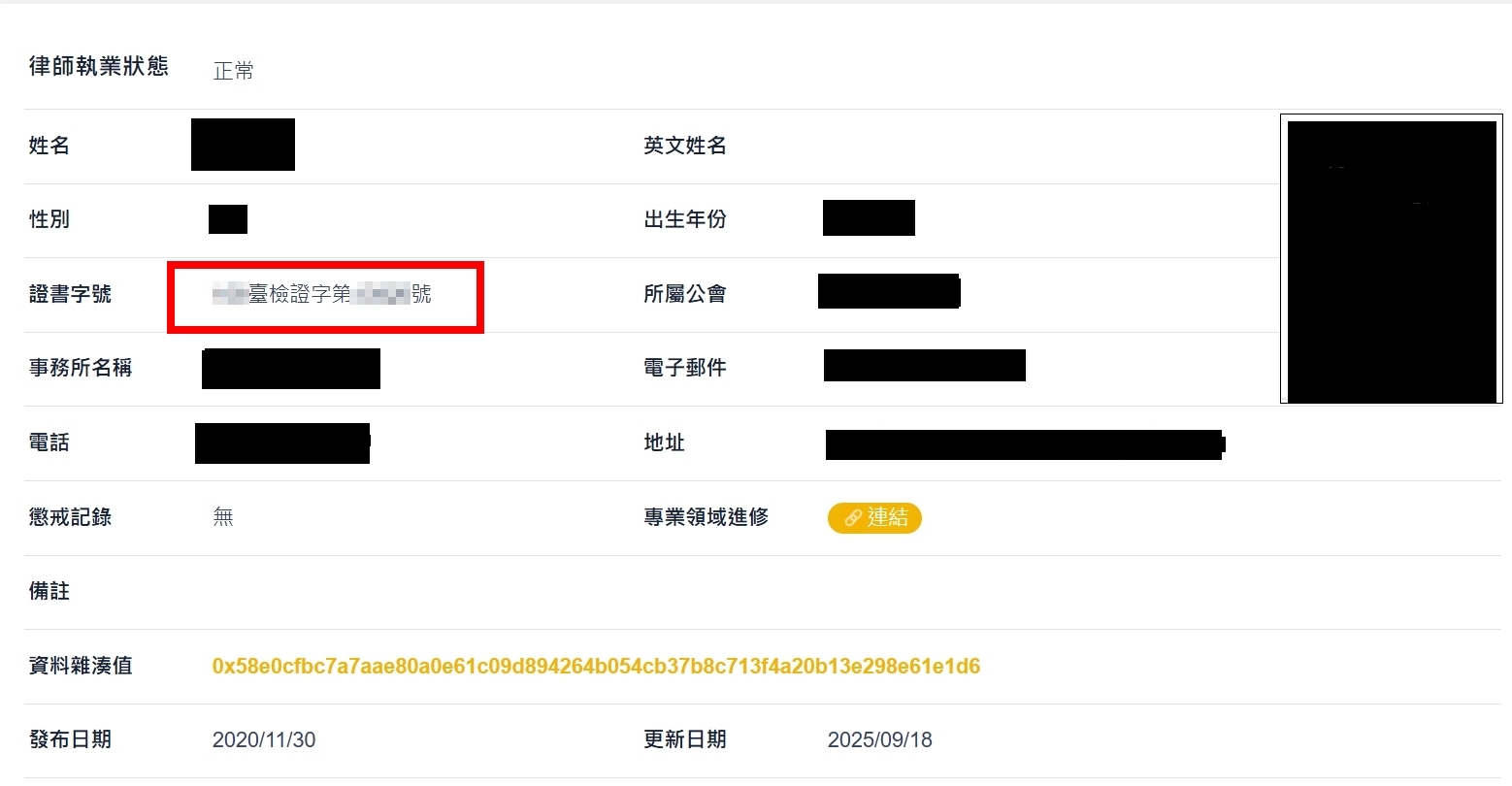 (一)「律師證號」為法務部頒發之「律師證書」字號,格式為xxx臺檢證字第ooo號,可上法務部律師查詢系統https://lawyerbc.moj.gov.tw/,輸入姓名及驗證碼後,進入資料頁面,複製「證書字號」欄位資訊,再至司法院頁面之欄位以ctrl+v貼上。